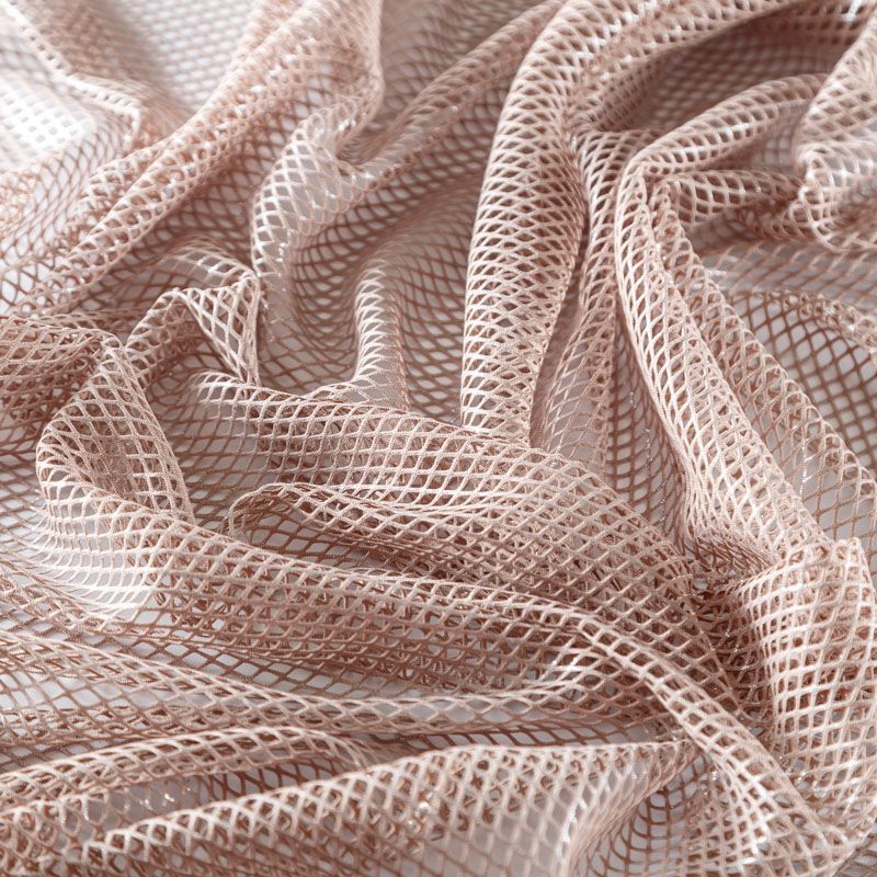 Рельефный полупрозрачный материал с сетчатой структурой. Поверхность полотна с металлизированным напылением, которое придает материалу легкий блеск и мерцание. Полотно мягкое, растяжимое во всех направлениях. Сетки нашли свое применение в процессе пошива и последующего декора вечерних нарядов, свадебных платьев, спортивной одежды, театральных костюмов..