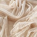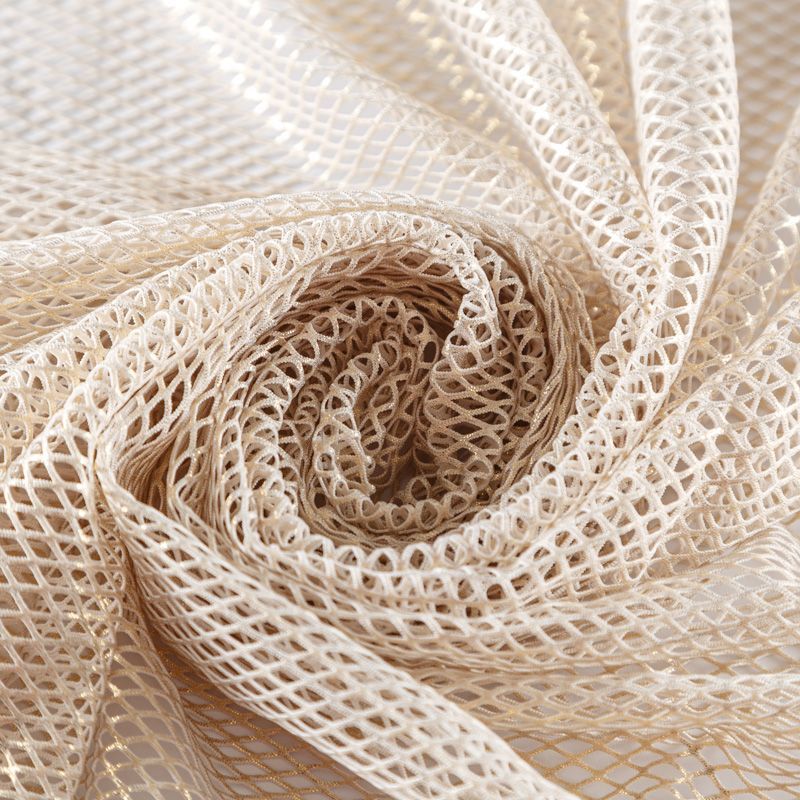 Рельефный полупрозрачный материал с сетчатой структурой. Поверхность полотна с металлизированным золотым напылением, которое придает материалу легкий блеск и мерцание. Полотно мягкое, растяжимое во всех направлениях. Сетки нашли свое применение в процессе пошива и последующего декора вечерних нарядов, свадебных платьев, спортивной одежды, театральных костюмов.