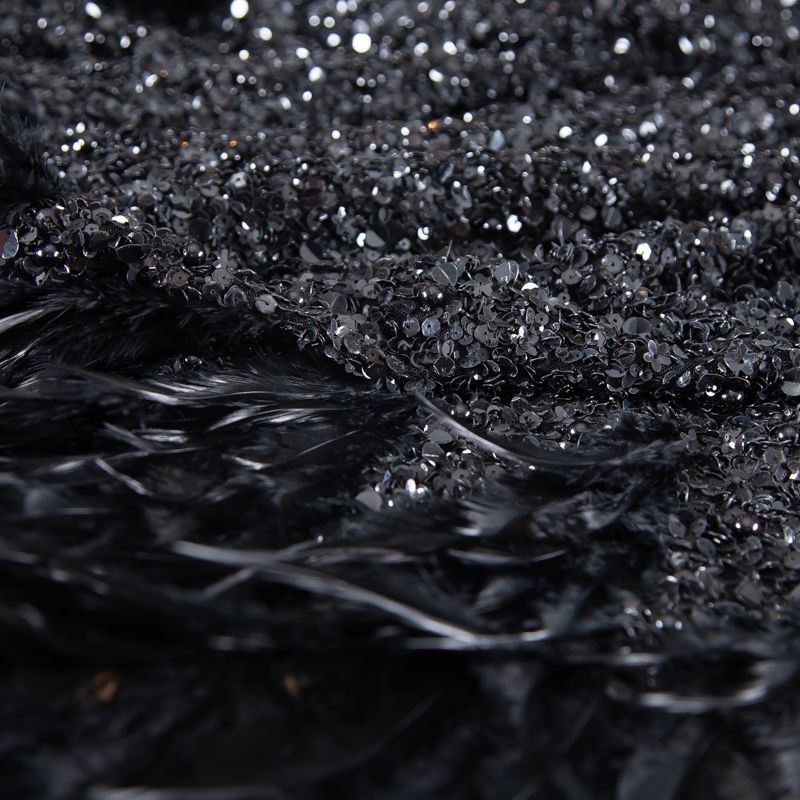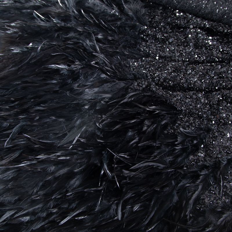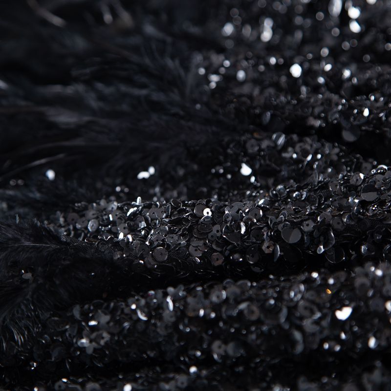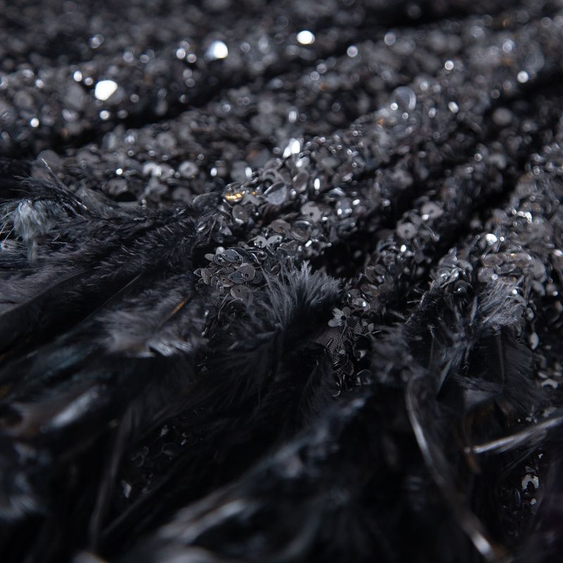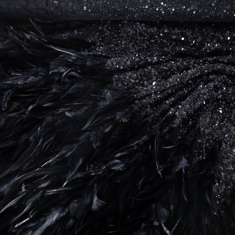 Эксклюзивная и лимитированная по количеству итальянская позиция для пошива нарядных образов! Эластичная сетчатая основа очень густо расшита черными глянцевыми пайетками, что обеспечивает непрозрачность полотна. Ширина полосы с роскошным густым черным пером около 40-45 см от нижней кромки, это позволяет экспериментировать с кроем для пошива различных изделий. Набирается на изделие объемом.