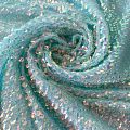 Тонкая эластичная сетка мятного цвета по всей поверхности усеяна объемными глянцевыми "бензиновыми" пайетками. Ткань очень хорошо драпируется, красиво переливается, имеет глянцевый блеск, пластичная и эластичная и в длину, и в ширину, набираются объемом. Пайетки — идеальный материал для праздников и вечеринок. Из них получится эффектное платье, жакет, боди, туника, юбка или комбинезон.