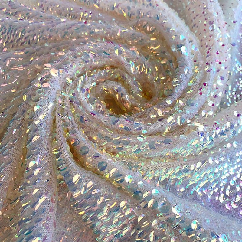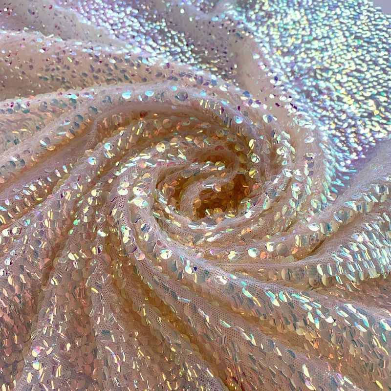Тонкая эластичная сетка абрикосового оттенка по всей поверхности усеяна объемными глянцевыми "бензиновыми" пайетками. Ткань очень хорошо драпируется, красиво переливается, имеет глянцевый блеск, пластичная и эластичная и в длину, и в ширину, набираются объемом. Пайетки — идеальный материал для праздников и вечеринок. Из них получится эффектное платье, жакет, боди, туника, юбка или комбинезон.