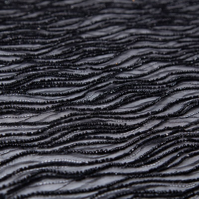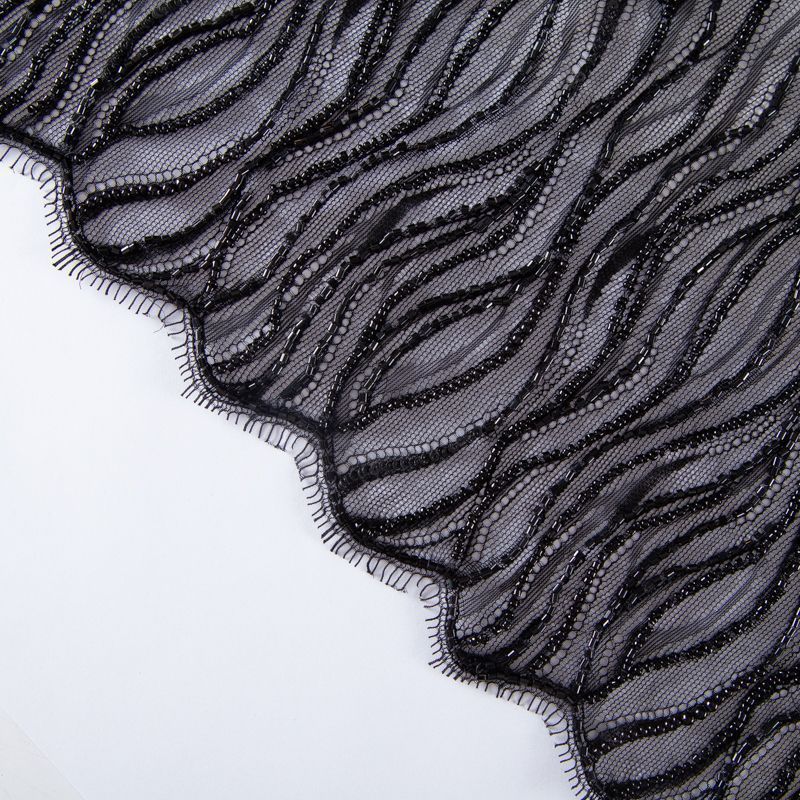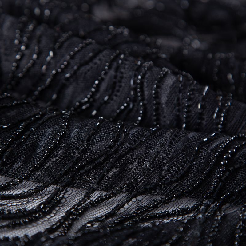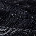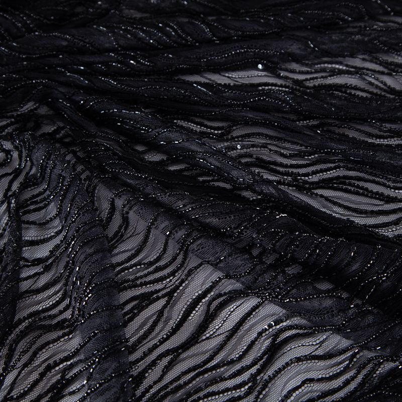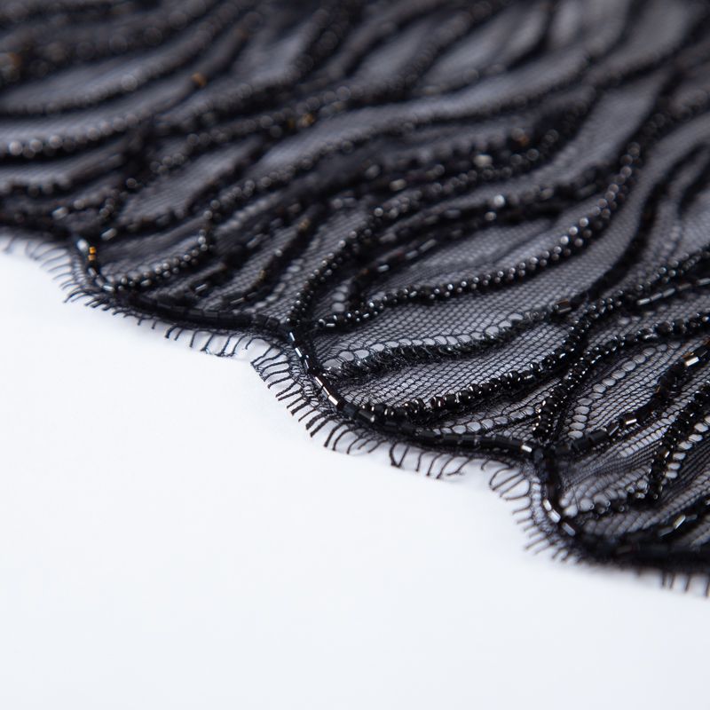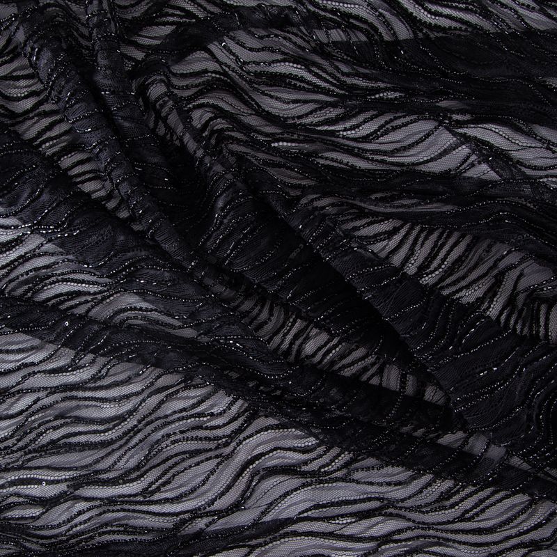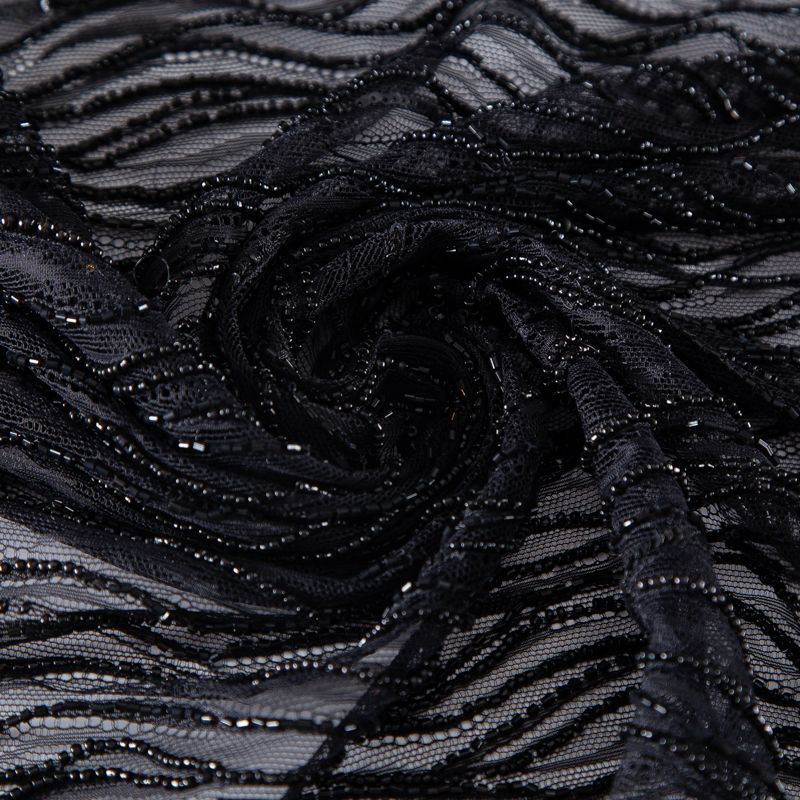 Нежнейшее итальянское кружево с насыщенной абстрактной вышивкой по всему полотну. Мерцание полотну придает нашитый стеклянный черный глянцевый бисер. Край полотна - фестон с "ресничками". Набирается на изделие объемом.