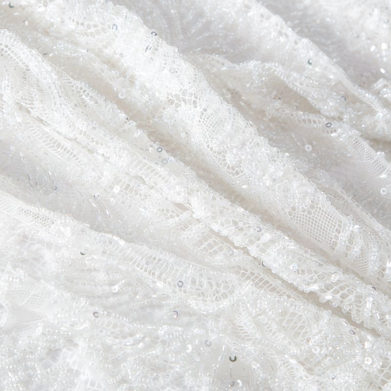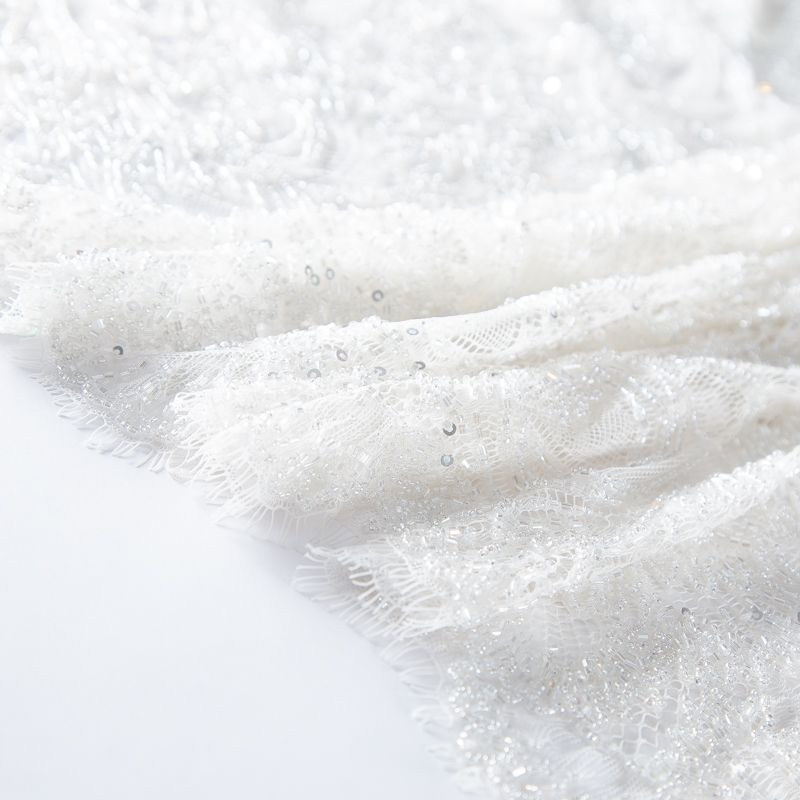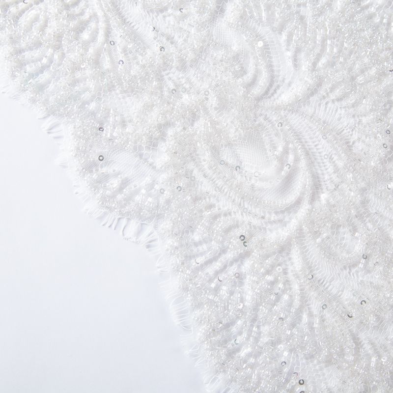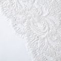 Нежнейшее итальянское кружево с насыщенной вышивкой по всему полотну. Мерцание цветочному узору придает нашитый стеклянный глянцевый бисер и микропайетки. Край полотна - фестон с "ресничками". Набирается на изделие объемом.