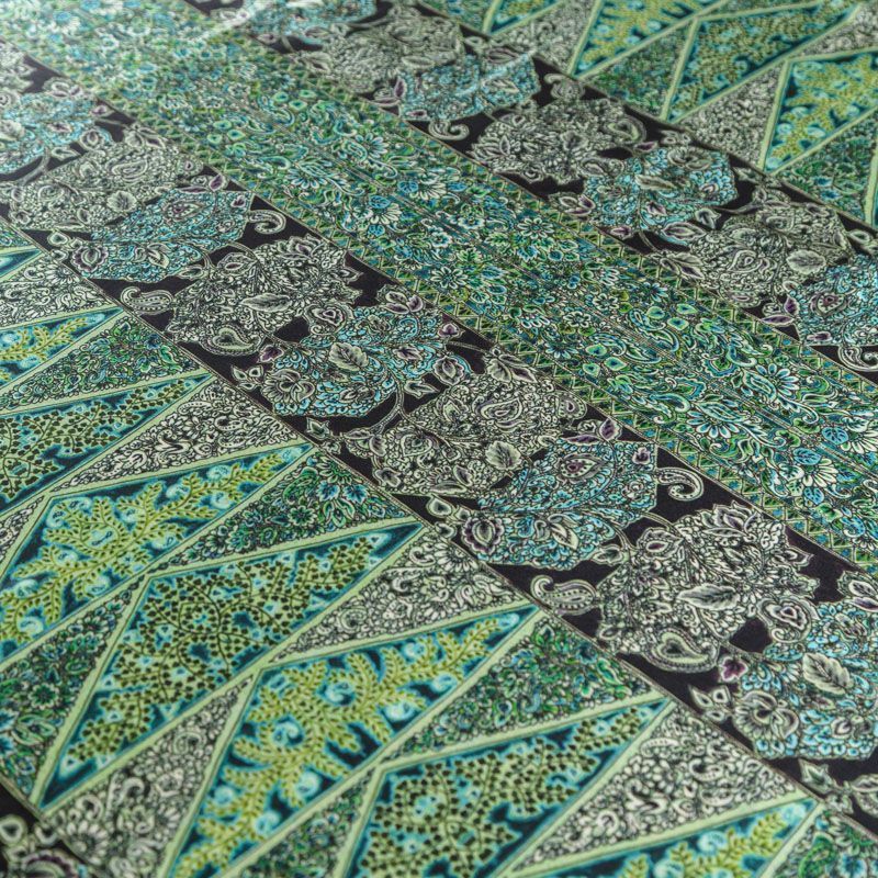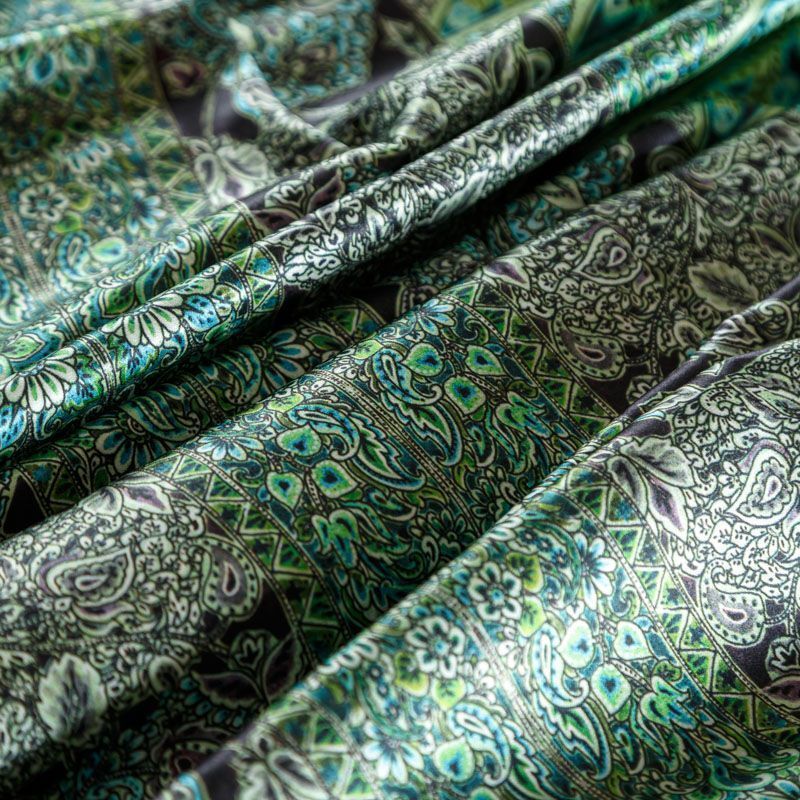 Итальянский атласный шелк с богатым орнаментом в зеленых оттенках. Ткань тонкая, не просвечивает, отлично драпируется, легкая и струящаяся, тянется за счет эластана в составе. Идеально подойдет для пошива платьев и сарафанов расклешенных моделей, с воланами, летящих юбок, топов, блузки, костюма в пижамном стиле.
