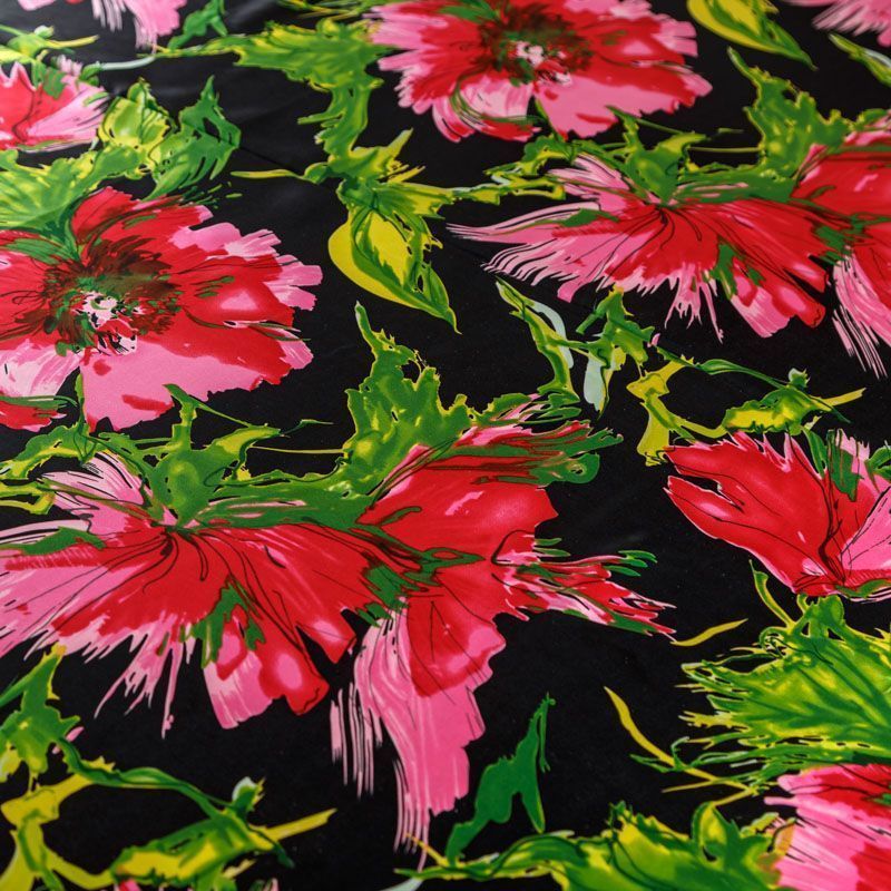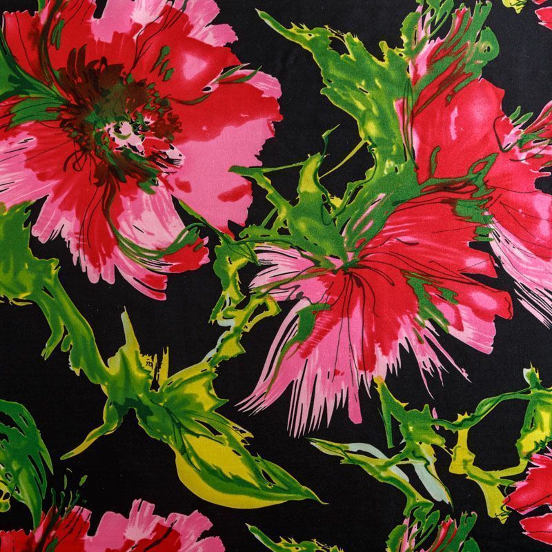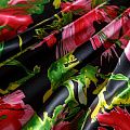 Итальянский атласный шелк с ярким цветочным принтом на черном фоне. Ткань тонкая, не просвечивает, отлично драпируется, легкая и струящаяся. Идеально подойдет для пошива платьев и сарафанов расклешенных моделей, с воланами, летящих юбок, топов, блузки, костюма в пижамном стиле.