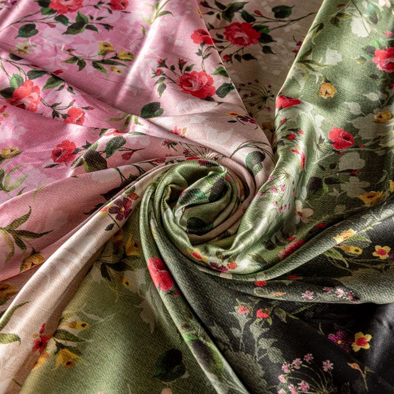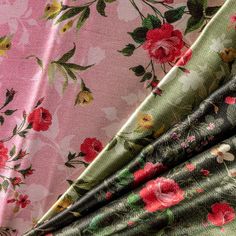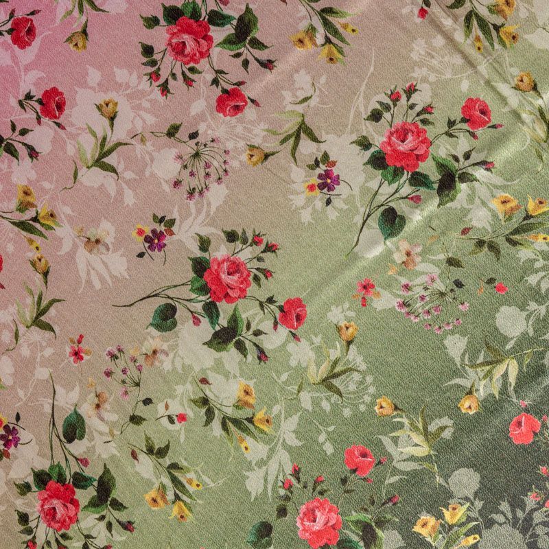 Итальянский натуральный шелк с эффектом деграде с плавным переходом от хаки до яркого-розового цвета, дополненный цветочным принтом, подойдет для ценителей ярких образов. Ткань имеет атласную поверхность, легкая, тонкая, струящаяся, хорошо драпируется. Будет идеальна для пошива летнего сарафана, платья, блузки, костюма в пижамном стиле, широких брюк или юбки.