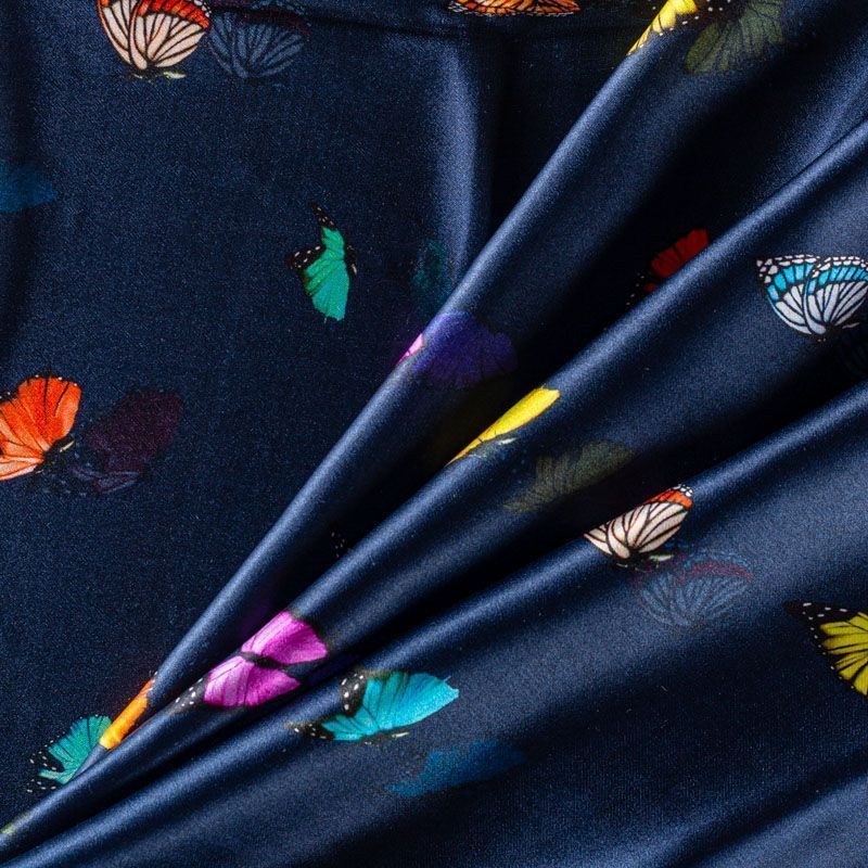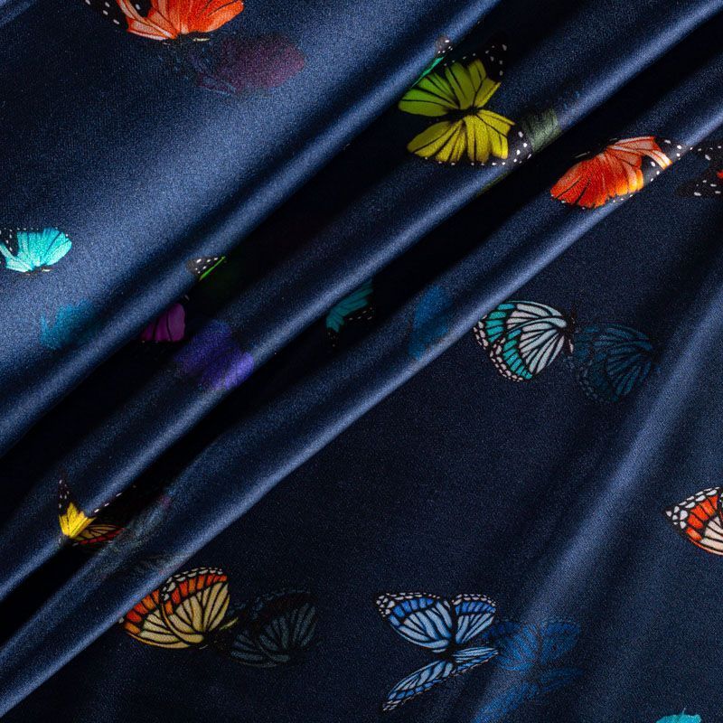 Итальянский шелк с матовой лицевой поверхностью и атласной изнанкой с анималистическим принтом на глубоком синем фоне, тонкий, не прозрачный, отлично драпируется, легкий и струящийся. Идеально подойдет для пошива платьев и сарафанов расклешенных моделей, с воланами, летящих юбок, топов, блузки, костюма в пижамном стиле.