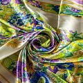 Итальянский атласный шелк с ярким цветным растительным принтом. Вдоль кромки оформлен цветными полосами в тон рисунку. Можно использовать в изделии по длине ткани и объемом. Ткань средней плотности, не просвечивает, струится, хорошо драпируется, не много тянется за счет эластана в составе. Поверхность глядкая, имеет благородный сатиновый блеск. Подойдет для смелых образов: летних платьев и сарафанов, как летящих фасонов, так и скроенных по косой, накидок, юбок, блузок, костюмов, широких брюк, домашней одежды.