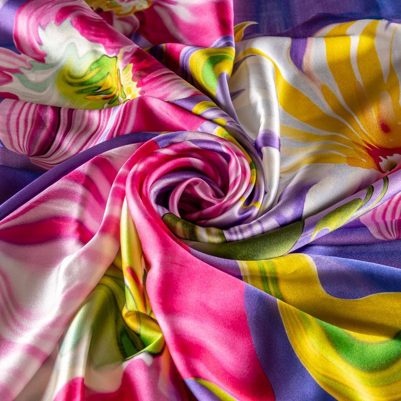 Итальянский атласный шелк с акварельным цветочным принтом на лавандовом фоне, тонкий, отлично драпируется, легкий. Идеально подойдет для пошива платьев и сарафанов расклешенных моделей, с воланами, рюшами, летящих юбок, топов, блузки, рубашки, костюма в пижамном стиле.