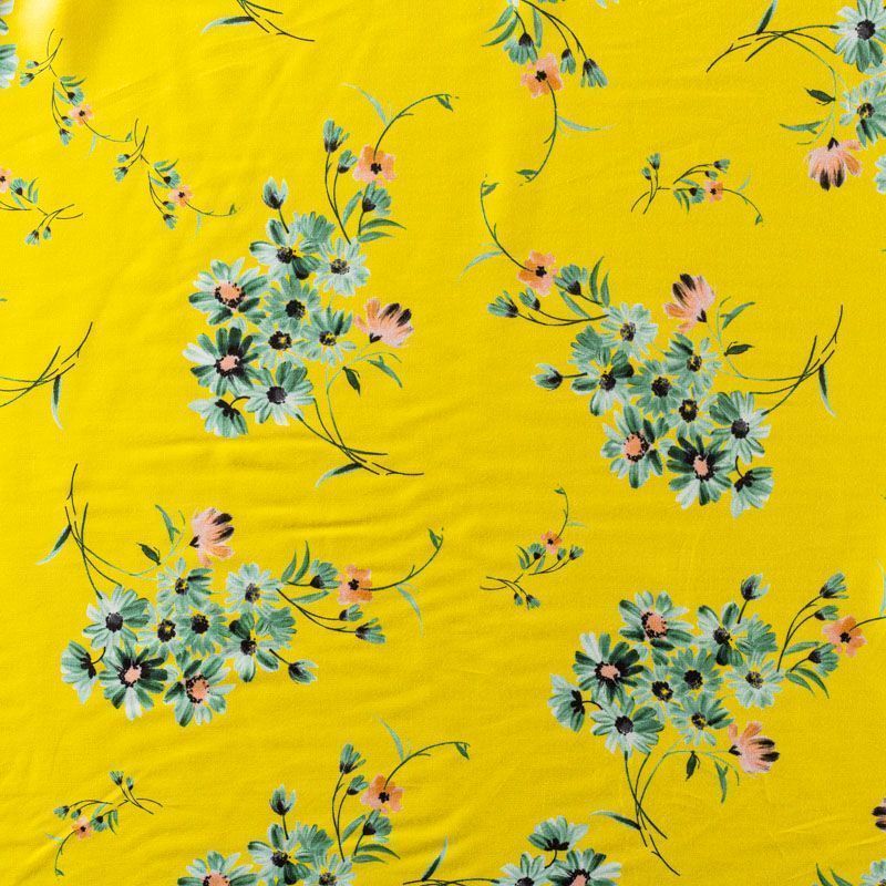 Итальянский плательно-блузочный штапель с добавлением шелка ярко-желтого оттенка с цветочным принтом и декоративным кантом вдоль кромки. Мягкий, нежный, пластичный, шелковистый на ощупь, хорошо драпируется, практичный. Особенно актуален летом, он очень легкий, обволакивающий прохладой. Идеален для пошива летней детской одежды, сарафанов, платьев, юбок, блузок, домашней одежды: халатов, ночной пижамы.