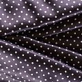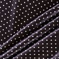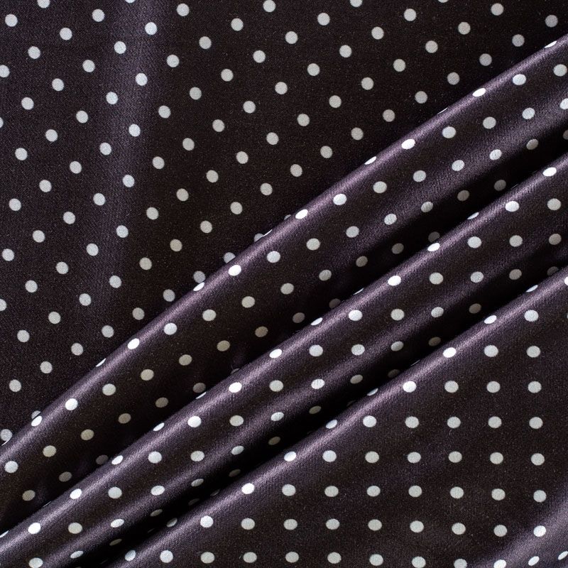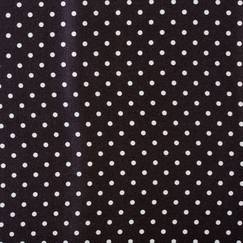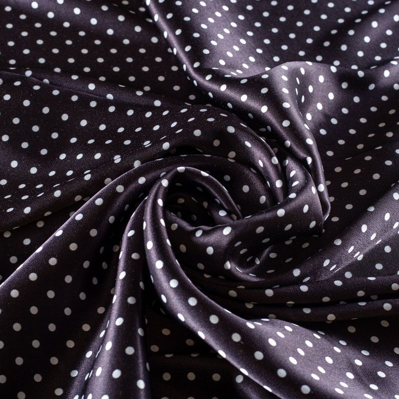 Итальянский плательно-блузочный штапель с добавлением шелка в черном цвете с классическим белым горохом. Ткань пластичная, формоустойчивая, поверхность атласная и шелковистая на ощупь, хорошо драпируется, практичная. Особенно актуальна летом, она очень легкая, обволакивающая прохладой. Идеальна для пошива сарафанов, платьев, юбок, блузок. костюма в пижамном стиле.