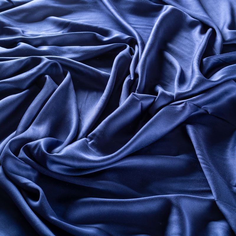 Плательно-блузочный штапель с добавлением шелка темно-синего оттенка. Мягкий, нежный, пластичный, шелковистый на ощупь, хорошо драпируется, практичный. Особенно актуален летом, он очень легкий, обволакивающий прохладой. Идеален для пошива летней детской одежды, сарафанов, платьев, юбок, блузок, домашней одежды: халатов, ночной пижамы.