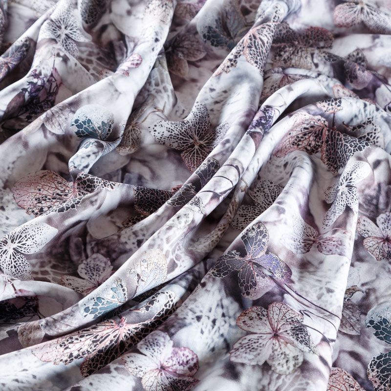 Плательно-блузочный штапель с добавлением шелка бело-лиловых оттенках с реалистичным растительным принтом. Мягкий, нежный, пластичный, шелковистый на ощупь, хорошо драпируется, практичный. Особенно актуален летом, он очень легкий, обволакивающий прохладой. Идеален для пошива летней детской одежды, сарафанов, платьев, юбок, блузок, домашней одежды: халатов, ночной пижамы.