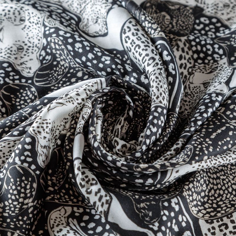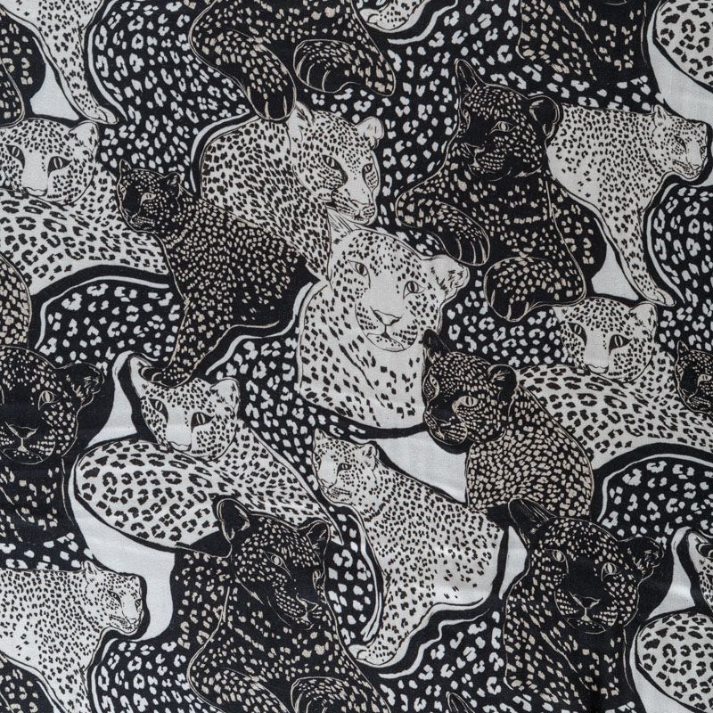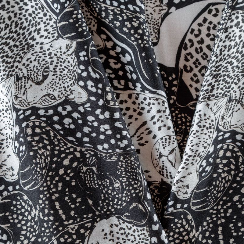 Итальянский плательно-блузочный штапель с добавлением шелка черного цвета со стилизованным анималичтическим принтом. Мягкий, нежный, пластичный, шелковистый на ощупь, хорошо драпируется, практичный. Особенно актуален летом, он очень легкий, обволакивающий прохладой. Идеален для пошива летней детской одежды, сарафанов, платьев, юбок, блузок, домашней одежды: халатов, ночной пижамы.