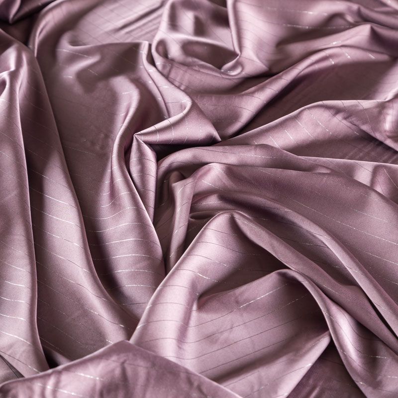 Тонкая, легкая, струящаяся ткань, декорированная тонкими вертикальными полосками люресовой нити, не просвечивает, очень нежная и прятная к телу, обладает благородным атласным блеском, хорошо драпируется, тянется за счет эластана в составе. Идеально подойдет для пошива блузок, платьев и юбок, а также топов, платков, домашней одежды.