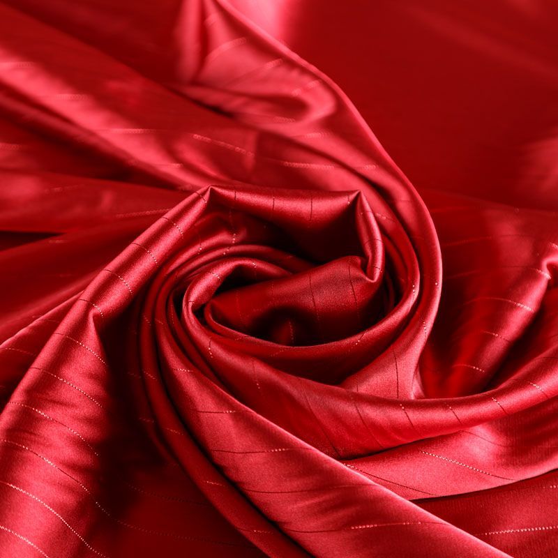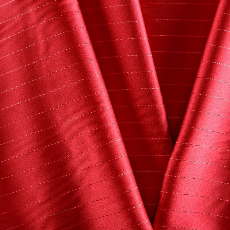 Тонкая, легкая, струящаяся ткань, декорированная тонкими вертикальными полосками люресовой нити, не просвечивает, очень нежная и прятная к телу, обладает благородным атласным блеском, хорошо драпируется, тянется за счет эластана в составе. Идеально подойдет для пошива блузок, платьев и юбок, а также топов, платков, домашней одежды.