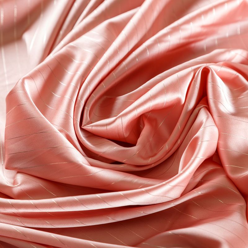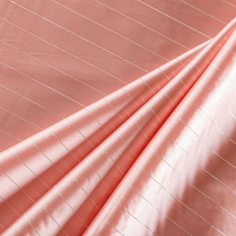 Тонкая, легкая, струящаяся ткань, декорированная тонкими вертикальными полосками люресовой нити, не просвечивает, очень нежная и прятная к телу, обладает благородным атласным блеском, хорошо драпируется, тянется за счет эластана в составе. Идеально подойдет для пошива блузок, платьев и юбок, а также топов, платков, домашней одежды.