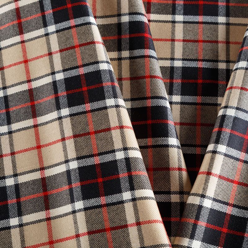 Костюмно-плательная итальянская шерсть средней плотности, мягкая, пластичная, хорошо драпируется и ниспадает. Очень теплая, уютная, не колется, в носке очень комфортная. Сочетание линий  черного, белого, красного и песочного цветов образуют сложную клетку тартан. Ткань прекрасно подойдет для пошива стильного платья прямого или расклешенного силуэта для сезона осень-зима, куртки-рубашки, юбки, костюмов, жакетов, брюк или шорт.