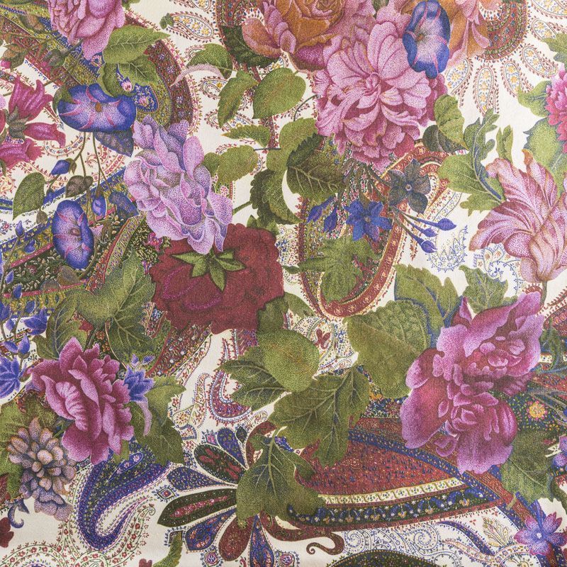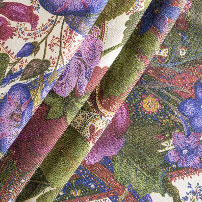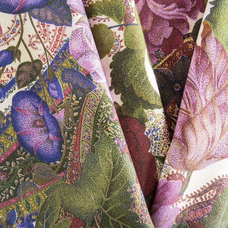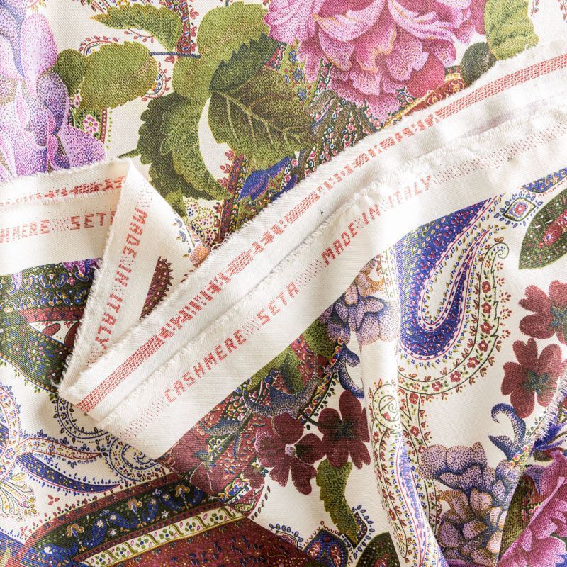 Итальянский плательный кашемир с добавлением шелка молочного оттенка цветочным принтом. Ткань тонкая, мягкая и пластичная, отлично драпируется. Поверхность матовая с твиловым плетением нитей. Прекрасно подойдет для создания осенних платьев, теплых туник, юбок, кофточек, а также аксессуаров, таких как палантины, шарфы, платки.