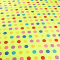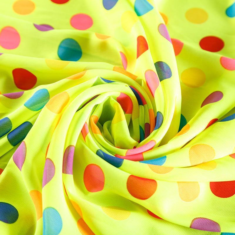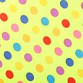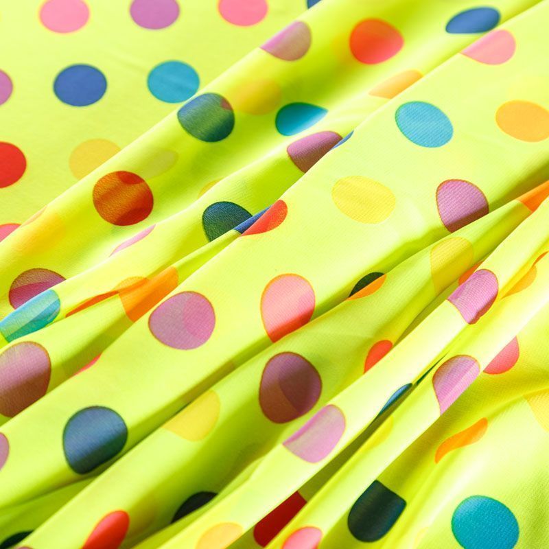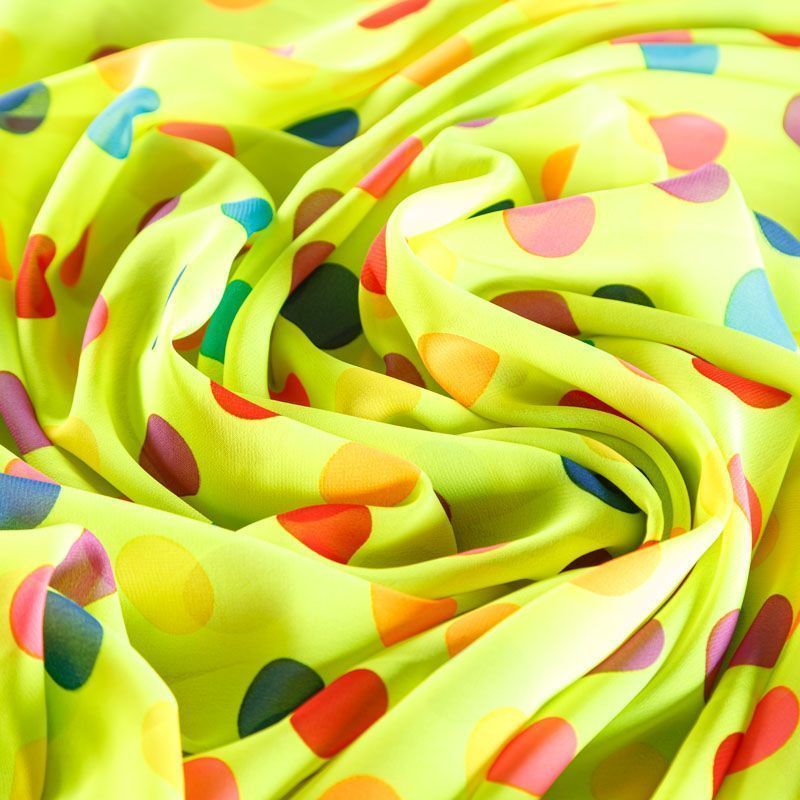 Шифон в ярко-желтом оттенке с разноцветными горохами. Струящийся, летящий, воздушный, полупрозрачный. На ощупь мягкий и приятный.Подойдет для пошива тончайших воздушных блуз, изумительных платьев со сборками и воланами и элегантных шарфов.