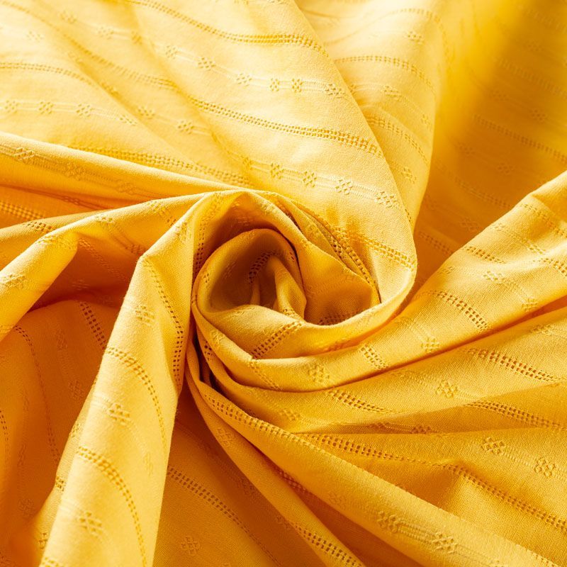 Мягкий и нежный итальянский хлопок желтого оттенка с изящной вышивкой. Узор выполнен путём машинной вышивки нитками в цвет ткани и расположен вдоль кромки. Фактура ткани неоднородная, имеет тенденцию к сминаемости, не много просвечивает, не тянется, приятная на ощупь. Идеально подходит для создания летних платьев, сарафанов, юбок, блузок и топов.