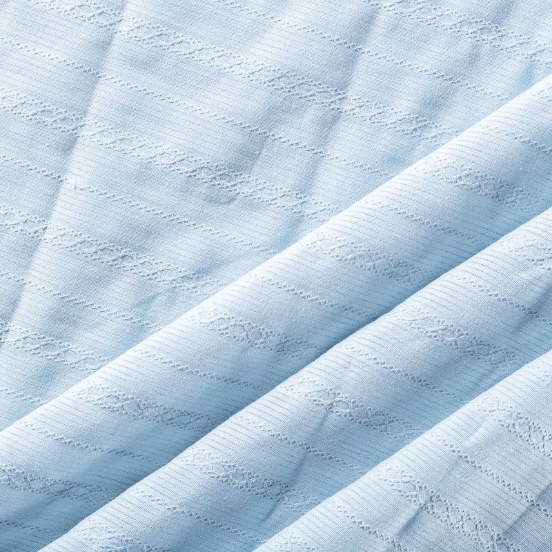 Мягкий и нежный итальянский хлопок выбеленного голубого оттенка с изящной вышивкой. Узор выполнен путём машинной вышивки нитками в цвет ткани и расположен вдоль кромки. Фактура ткани неоднородная, имеет тенденцию к сминаемости, не много просвечивает, не тянется, приятная на ощупь. Идеально подходит для создания летних платьев, сарафанов, юбок, блузок и топов.