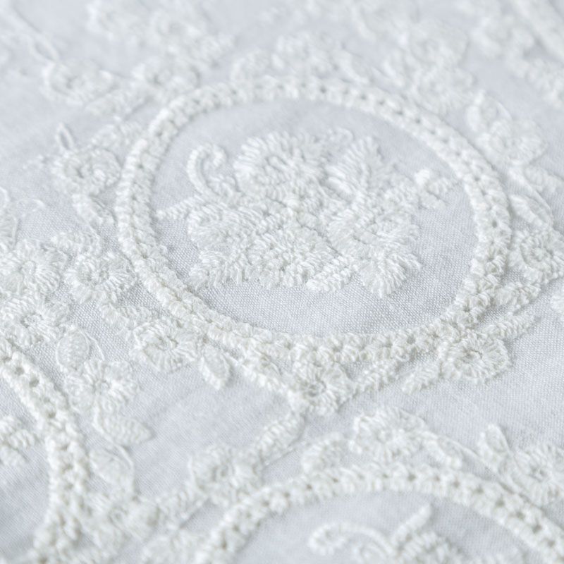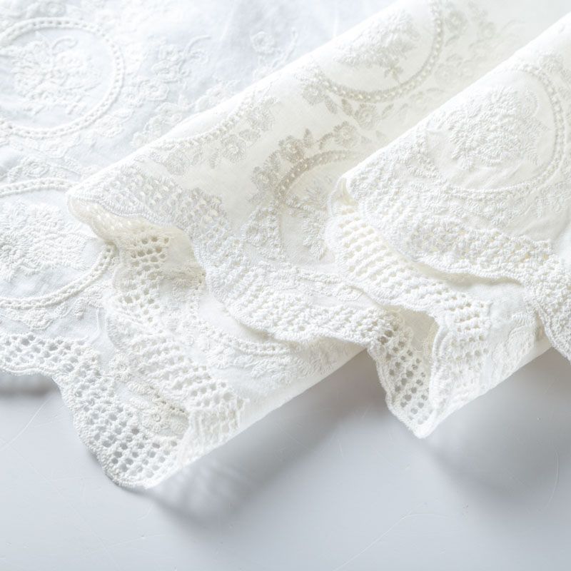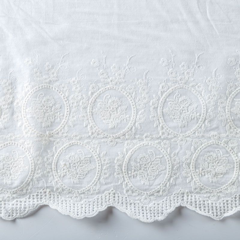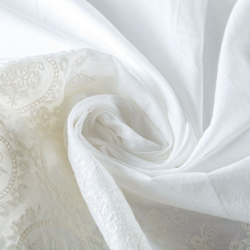 Мягкий и нежный хлопок молочного оттенка с изящной вышивкой. Узор выполнен путём машинной вышивки нитками в цвет ткани и расположен вдоль кромки. Фактура ткани однородная, имеет тенденцию к сминаемости, просвечивает, не тянется, приятная на ощупь. Идеально подходит для создания летних платьев, сарафанов, юбок, блузок и топов.
