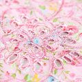 Мягкий и нежный хлопок розового оттенка с мелким романтичным цветочным принтом украшен изящной вышивкой и перфорацией.  Узор выполнен путём машинной вышивки нитками в цвет ткани и расположен вдоль одной кромки, поэтому набирается на изделие объемом. Ткань тонкая, легкая, не сухая, имеет тенденцию к сминаемости, не много просвечивает, не тянется, приятная на ощупь. Идеально подходит для создания летних платьев, сарафанов, юбок, блузок, топов, шорт.