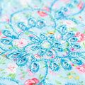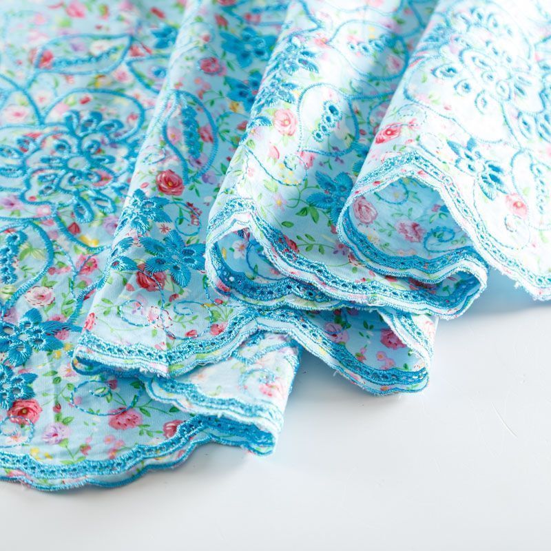 Мягкий и нежный хлопок голубого оттенка с мелким романтичным цветочным принтом украшен изящной вышивкой и перфорацией.  Узор выполнен путём машинной вышивки нитками в цвет ткани и расположен вдоль одной кромки, поэтому набирается на изделие объемом. Ткань тонкая, легкая, не сухая, имеет тенденцию к сминаемости, не много просвечивает, не тянется, приятная на ощупь. Идеально подходит для создания летних платьев, сарафанов, юбок, блузок, топов, шорт.