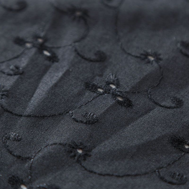 Мягкий и нежный хлопок черного оттенка с вышивкой и перфорацией. Узор выполнен путём машинной вышивки нитками в цвет ткани и расположен по всему полотну. Фактура ткани однородная, имеет тенденцию к сминаемости, не тянется, приятная на ощупь. Может потребоваться подклад. Идеально подходит для создания летних платьев, сарафанов, юбок, блузок и топов.