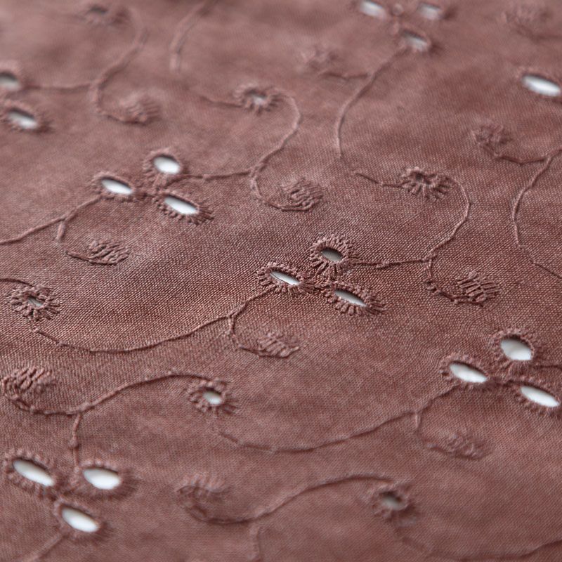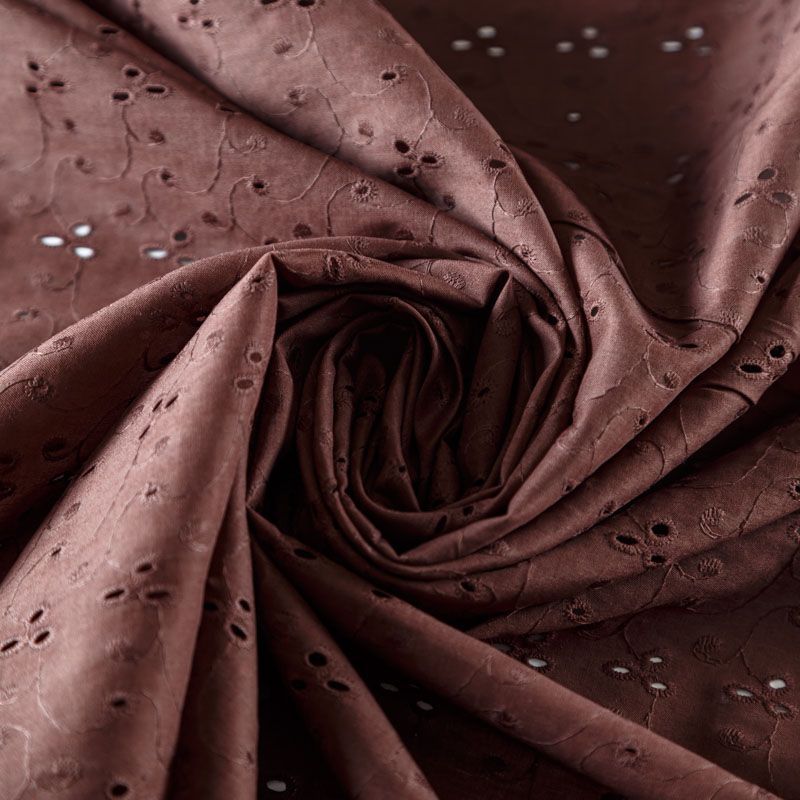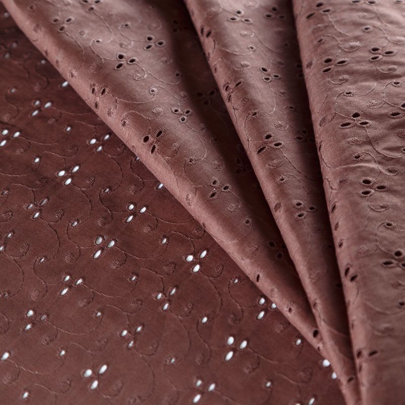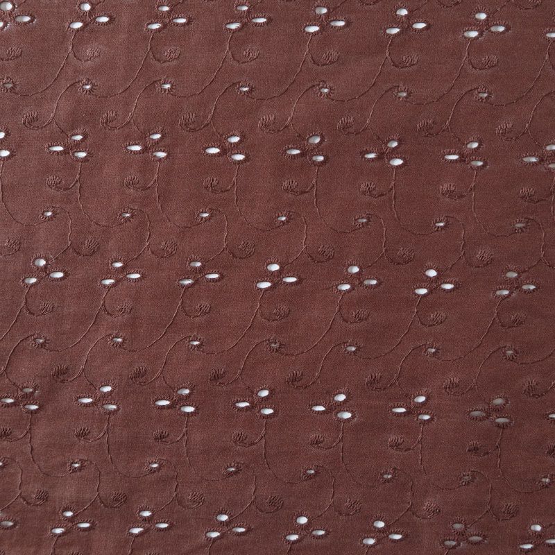 Мягкий и нежный хлопок шоколадного оттенка с вышивкой и перфорацией. Узор выполнен путём машинной вышивки нитками в цвет ткани и расположен по всему полотну. Фактура ткани однородная, имеет тенденцию к сминаемости, не тянется, приятная на ощупь. Может потребоваться подклад. Идеально подходит для создания летних платьев, сарафанов, юбок, блузок и топов.