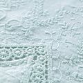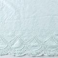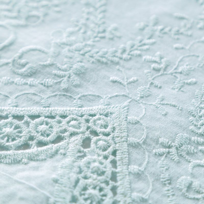 Мягкий и нежный хлопок мятного оттенка с изящной вышивкой. Узор выполнен путём машинной ажурной вышивки "ришелье" нитками в цвет ткани и расположен вдоль кромки. Фактура ткани однородная, имеет тенденцию к сминаемости, просвечивает, не тянется, приятная на ощупь. Идеально подходит для создания летних платьев, сарафанов, юбок, блузок и топов.