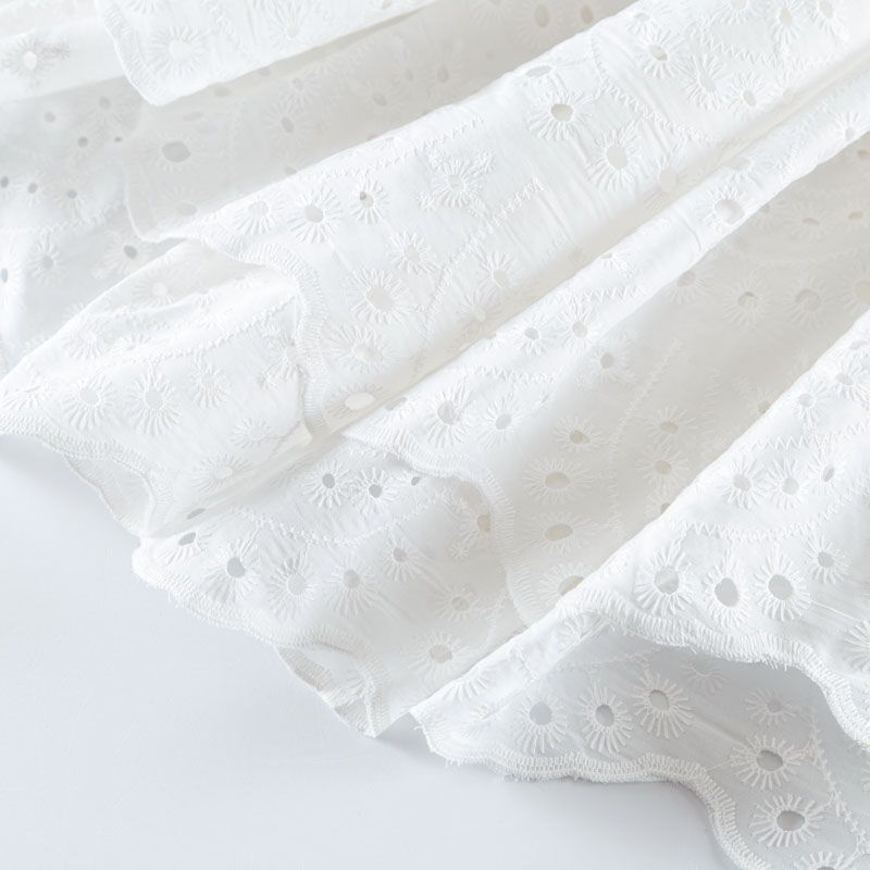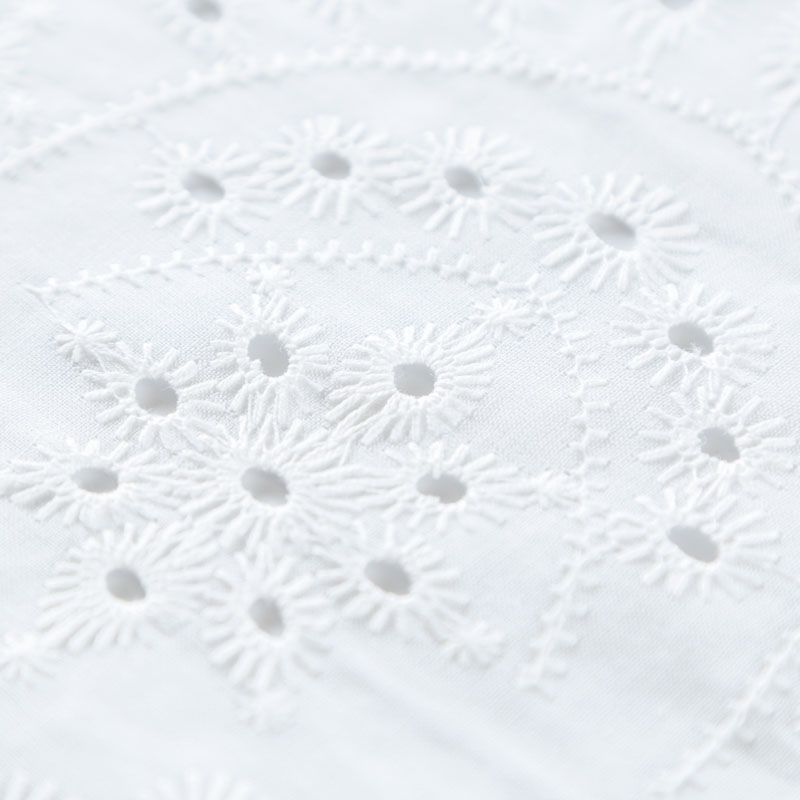 Итальянское шитье на белоснежной хлопковой основе с геометрической, элегантной вышивкой, расположеннной по всему полотну. Ткань мягкая, легкая, пластичная, приятная на ощупь, просвечивает, потребуется подклад. Обе кромки ткани оформлены фигурными фестонами. Идеально подойдет для пошива рубашки, блузы, топа в воланами, туники, платья, сарафана, юбки, шорт.