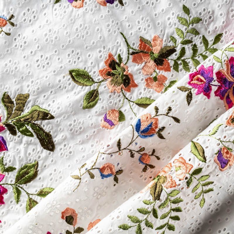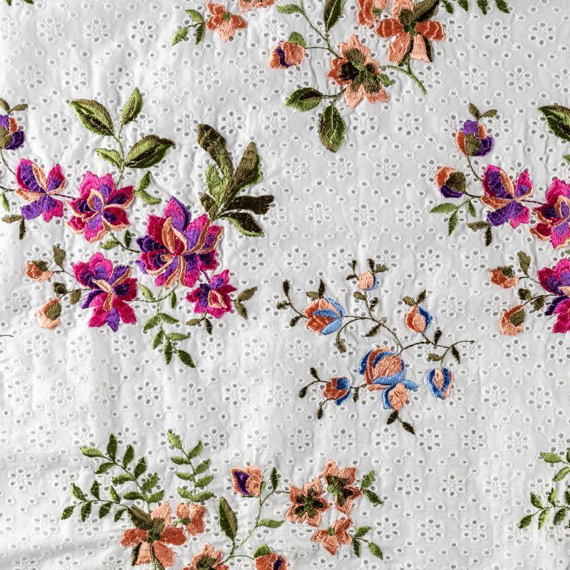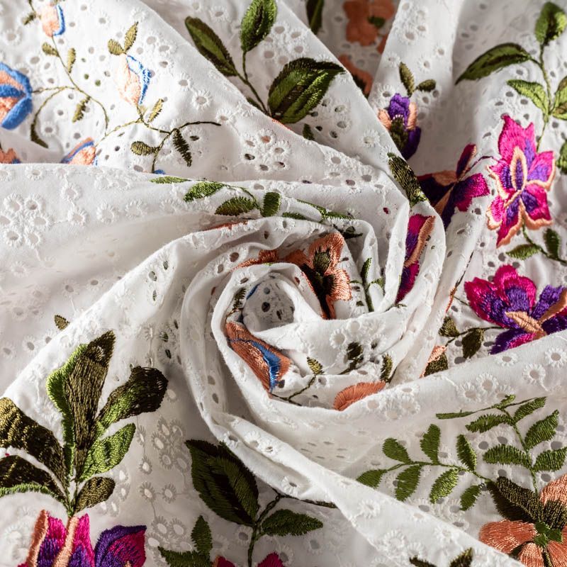 Мягкий итальянский хлопок ришелье белого цвета с цветной яркой вышивкой. Фактура ткани обладает легкой рельефностью, имеет тенденцию к сминаемости, немного просвечивает, не тянется, приятный на ощупь. Хлопок прекрасно пропускает воздух, идеально подходит для создания летних платьев, сарафанов, юбок, блузок и топов.