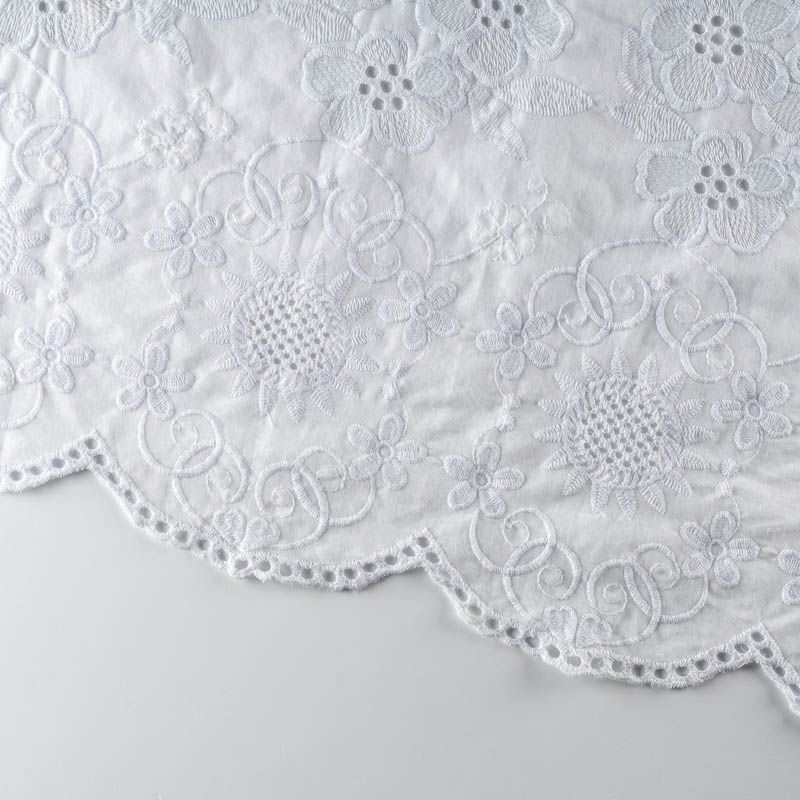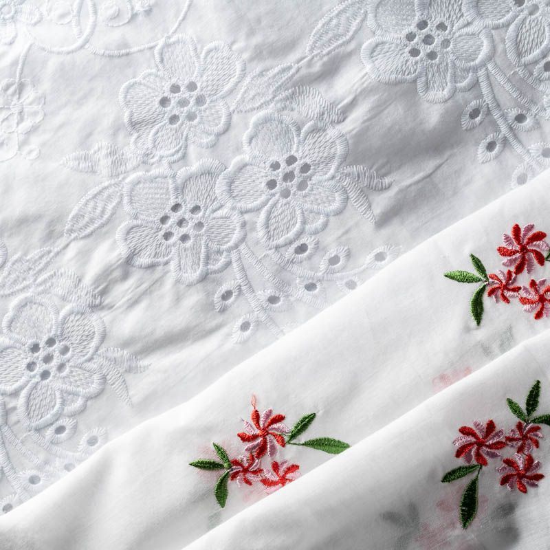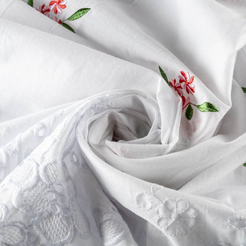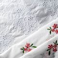 Мягкий хлопок белого цвета с яркой цветочной вышивкой. Фактура ткани гладкая, имеет тенденцию к сминаемости, немного просвечивает, не тянется, приятная на ощупь. Хлопок прекрасно пропускает воздух, идеально подходит для создания летних платьев, сарафанов, юбок, блузок и топов. Ткань идет купоном (каймой) вдоль одной кромки. Купон выполнен путём машинной вышивки нитками в цвет ткани. Набирается объемом.