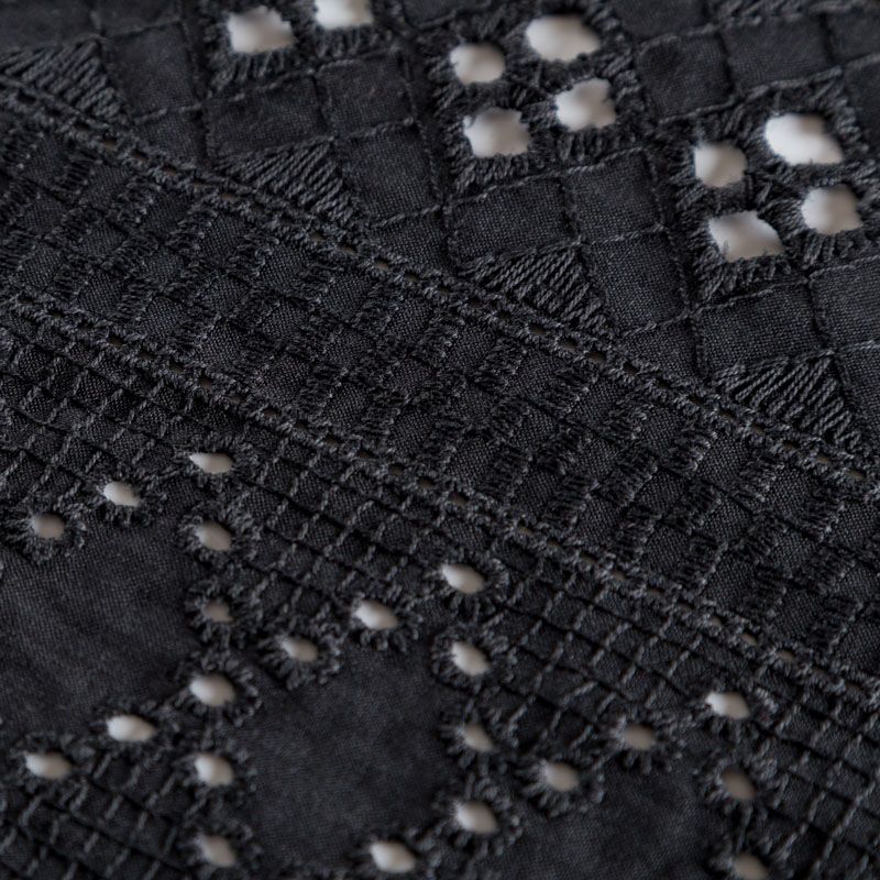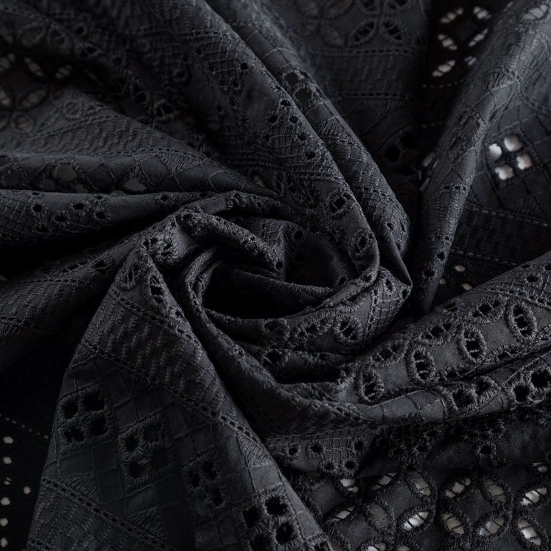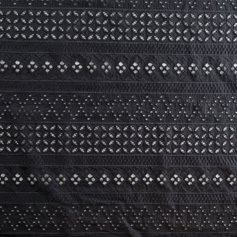 Мягкий и нежный хлопок черного цвета с изящной вышивкой и перфорацией.  Узор выполнен путём машинной вышивки нитками в цвет ткани и расположен вдоль кромки. Фактура ткани неоднородная, имеет тенденцию к сминаемости, не много просвечивает, не тянется, приятная на ощупь. Идеально подходит для создания летних платьев, сарафанов, юбок, блузок, топов, шорт.