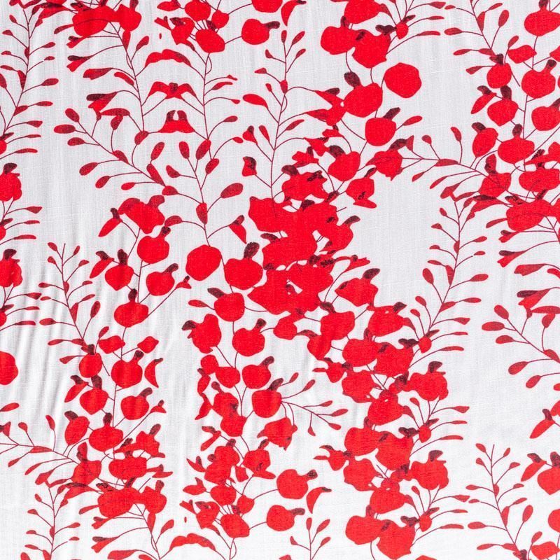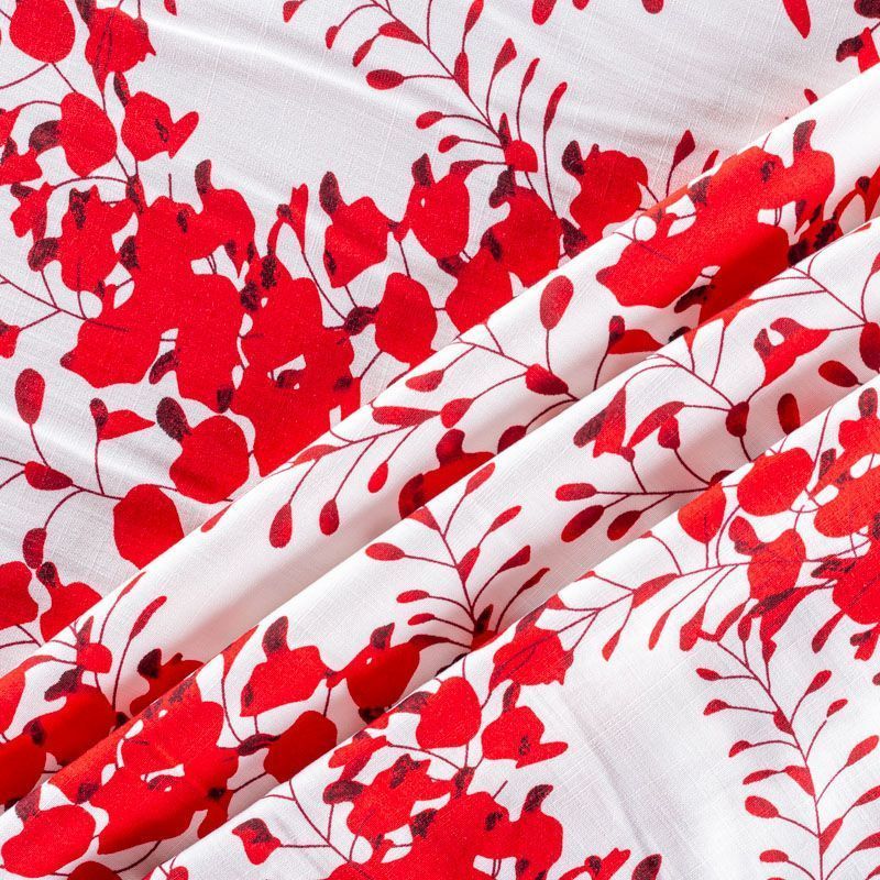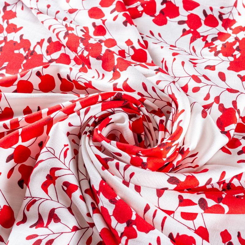 Плательно-блузочный штапель с фантазийным цветочным принтом в красных оттенках на белом фоне. Ткань мягкая, тонкая, нежная, пластичная, приятная на ощупь, хорошо драпируется, практичная, поверхность слегка фактурная. Подойдет для пошива платья, топа, блузки, рубашки, юбки, летних брюк.