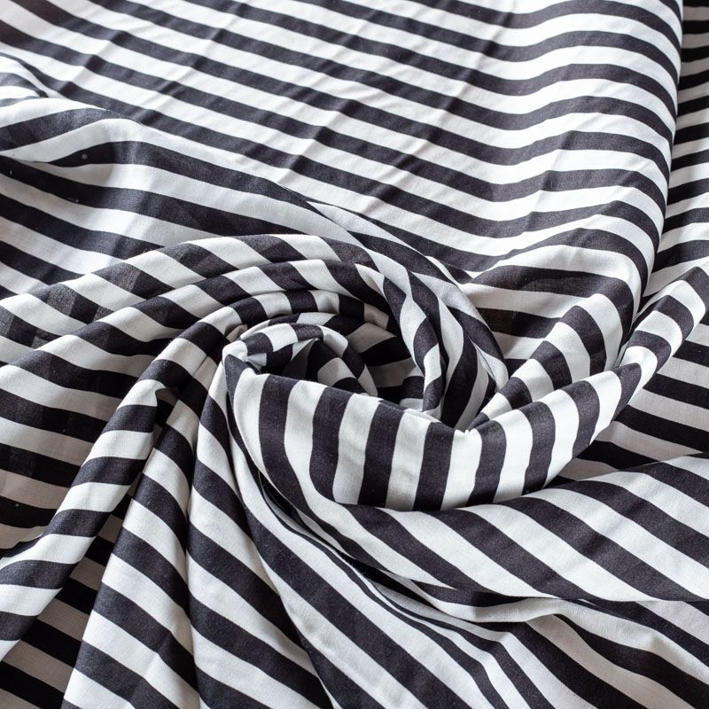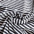 Плательно-блузочный штапель в вертикальную полоску средней ширины черного цвета. Ткань мягкая, тонкая, нежная, пластичная, приятная на ощупь, хорошо драпируется, практичная, поверхность слегка фактурная. Подойдет для пошива платья, топа, блузки, рубашки, юбки, летних брюк.