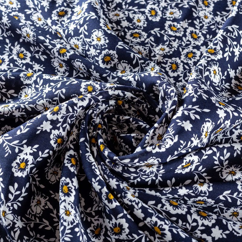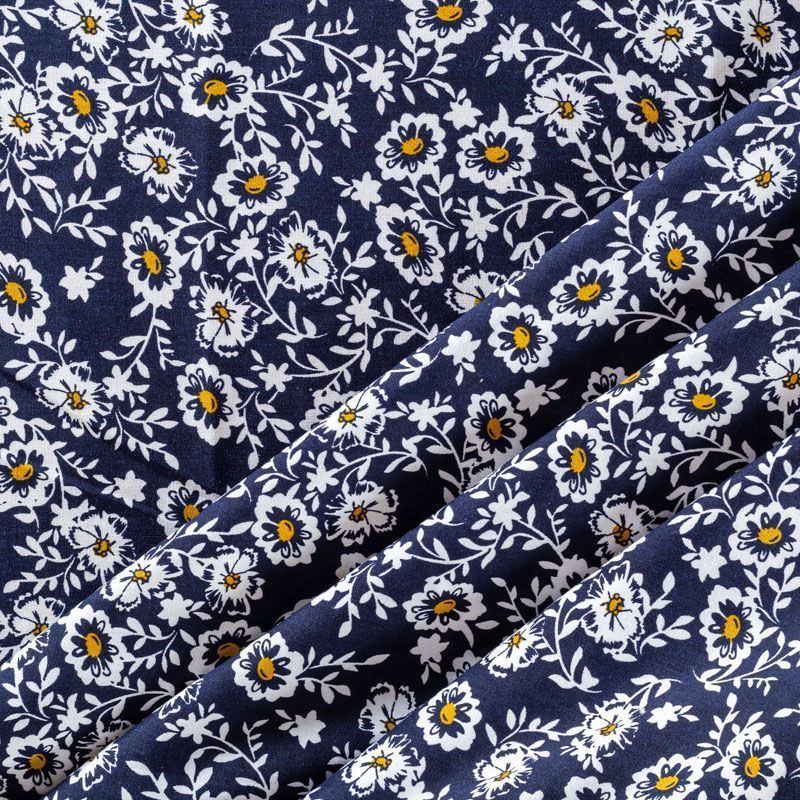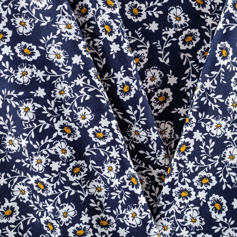 Плательно-блузочный штапель с не крупным цветочным принтом на темно-синем фоне. Мягкий, тонкий, нежный, пластичный, приятный на ощупь, хорошо драпируется, практичный. Подойдет для пошива платья, топа, блузки, рубашки, юбки, летних брюк.