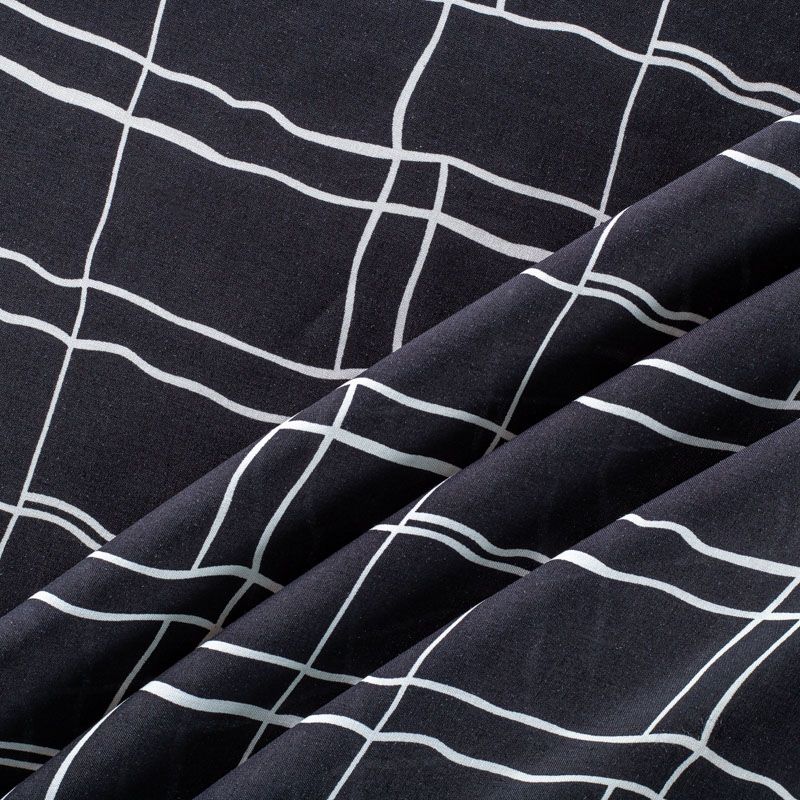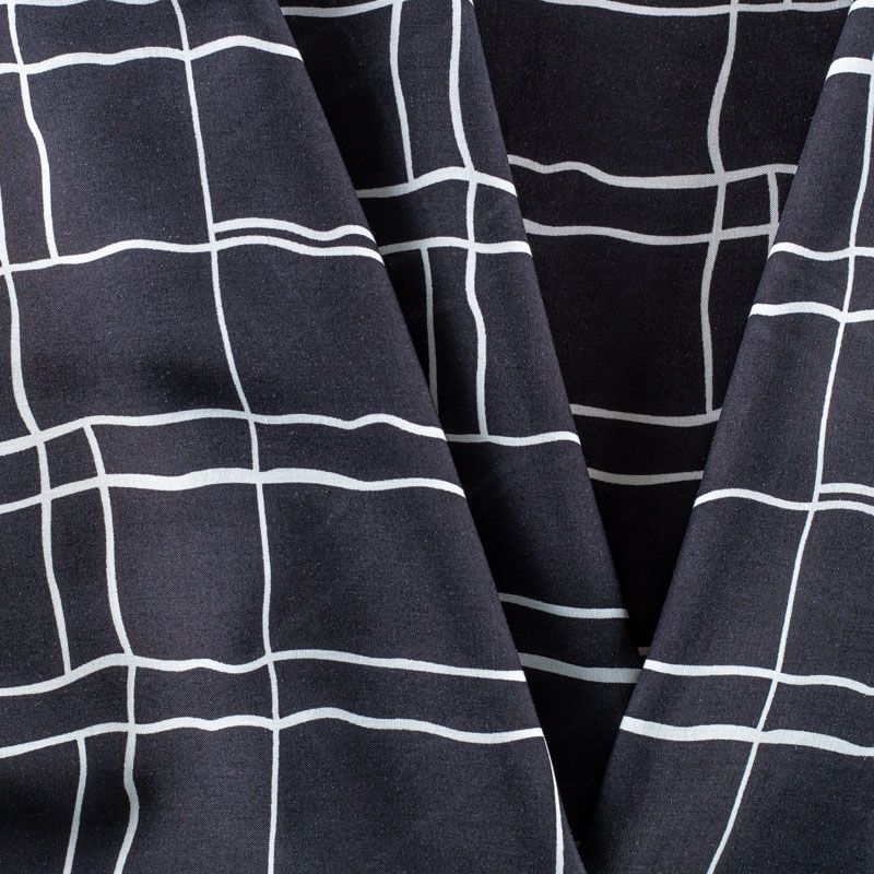 Плательно-блузочный штапель с геометрическим принтом, образующим клетку, на черном фоне. Мягкий, тонкий, нежный, пластичный, приятный на ощупь, хорошо драпируется, практичный. Подойдет для пошива платья, топа, блузки, рубашки, юбки, летних брюк.