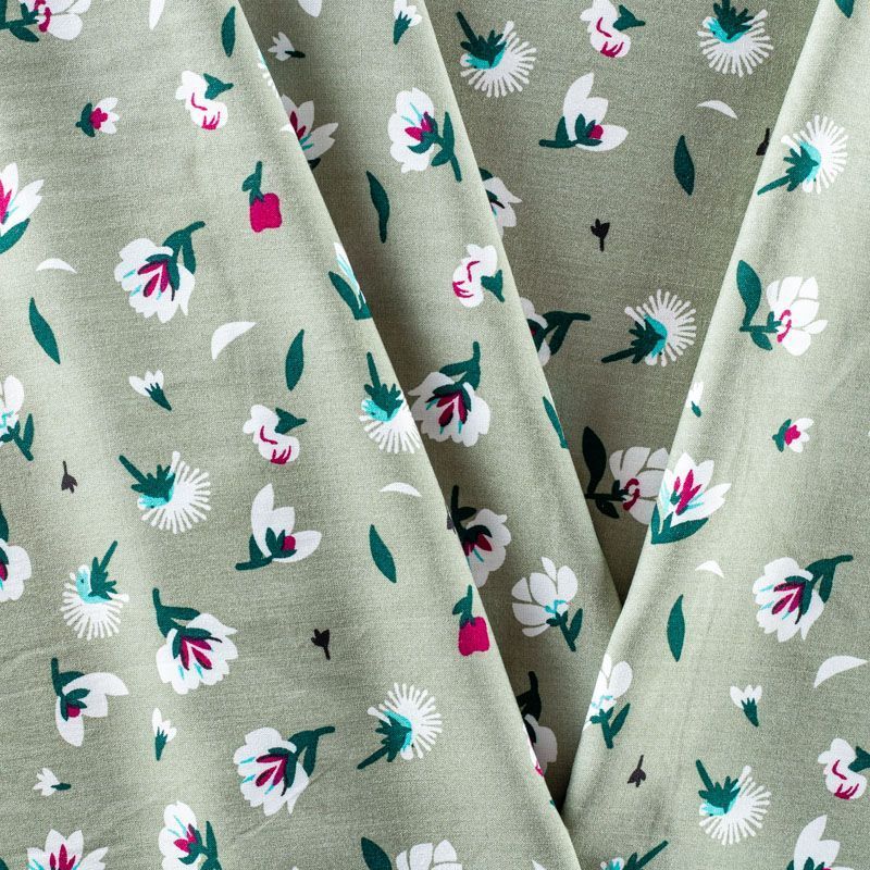 Плательно-блузочный штапель зеленого оттенка с мелким цветочным принтом. Ткань мягкая, тонкая, нежная, пластичная, приятная на ощупь, хорошо драпируется, практичная, поверхность слегка фактурная. Подойдет для пошива платья, топа, блузки, рубашки, юбки, летних брюк.