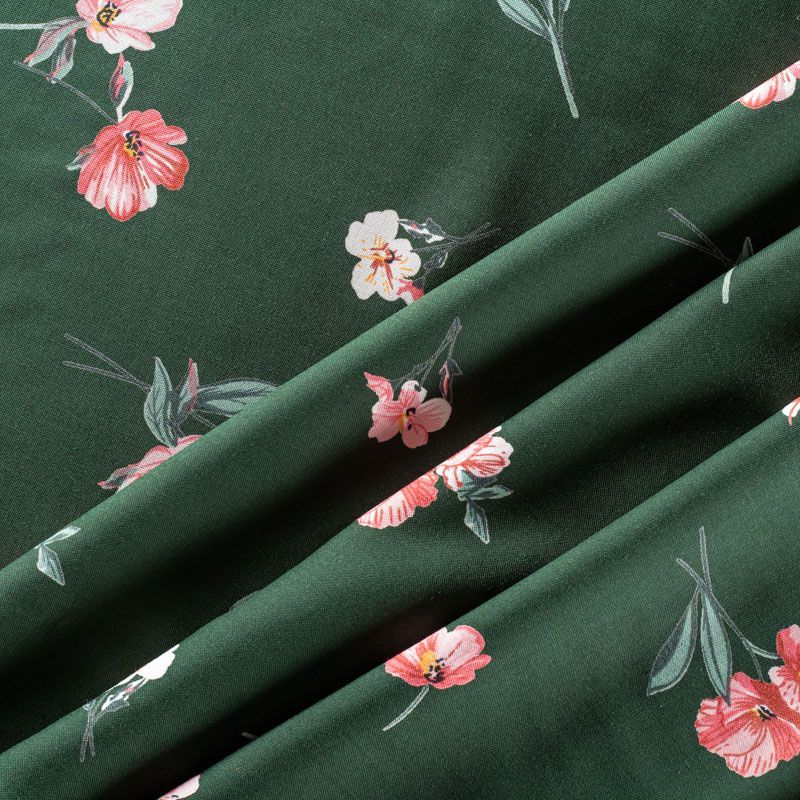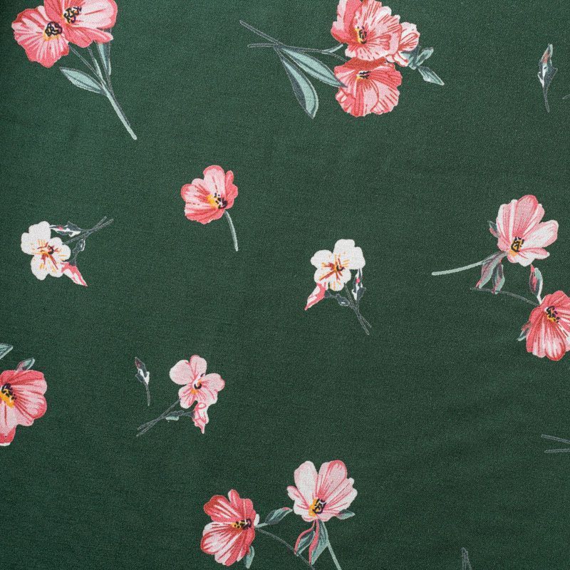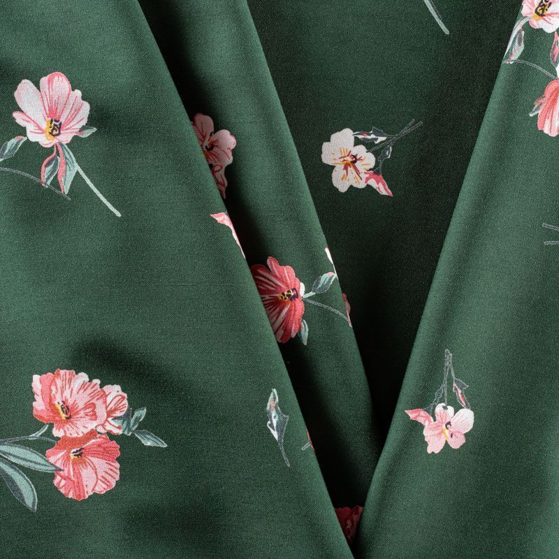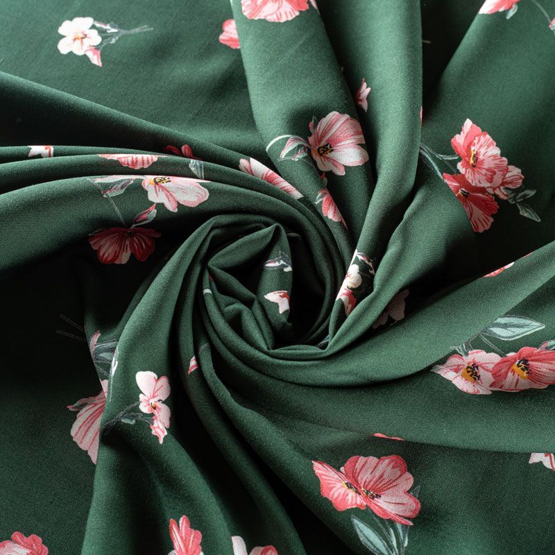 Плательно-блузочный штапель с мелким цветочным принтом на темно-зеленом фоне. Мягкий, тонкий, нежный, пластичный, приятный на ощупь, хорошо драпируется, практичный. Подойдет для пошива платья, топа, блузки, рубашки, юбки, летних брюк.