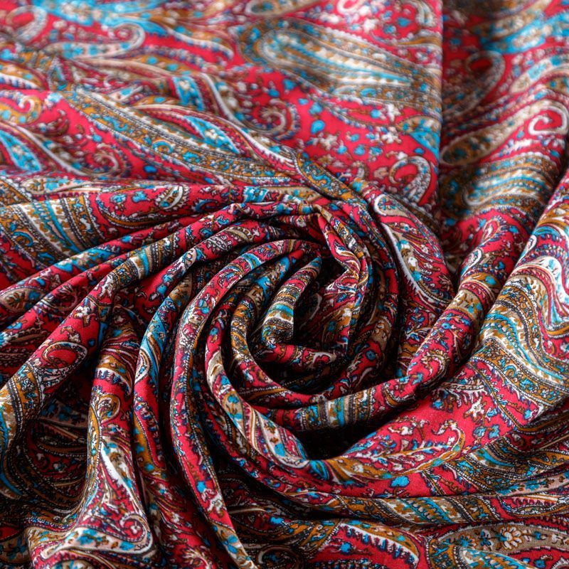 Плательно-блузочный штапель с ярким узором пейсли на малиново-красном фоне. Ткань мягкая, тонкая, нежная, пластичная, приятная на ощупь, хорошо драпируется, практичная. Подойдет для пошива платья, топа, блузки, рубашки, юбки, летних брюк.