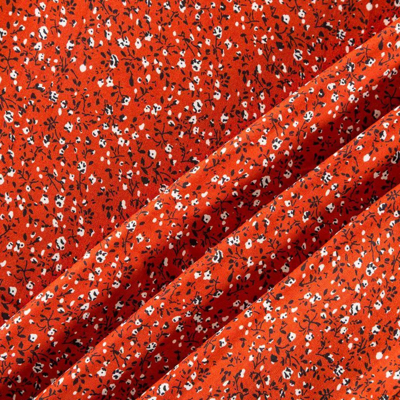 Плательно-блузочный штапель с мелким растительным принтом на темном апельсиновом фоне. Мягкий, тонкий, нежный, пластичный, приятный на ощупь, хорошо драпируется, практичный. Подойдет для пошива платья, топа, блузки, рубашки, юбки, летних брюк, комбинезона.