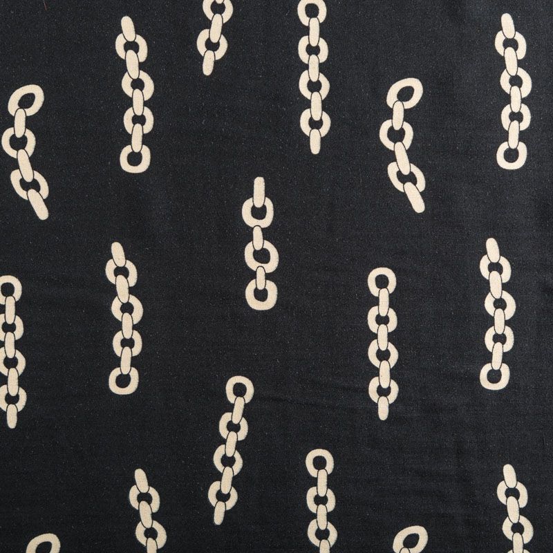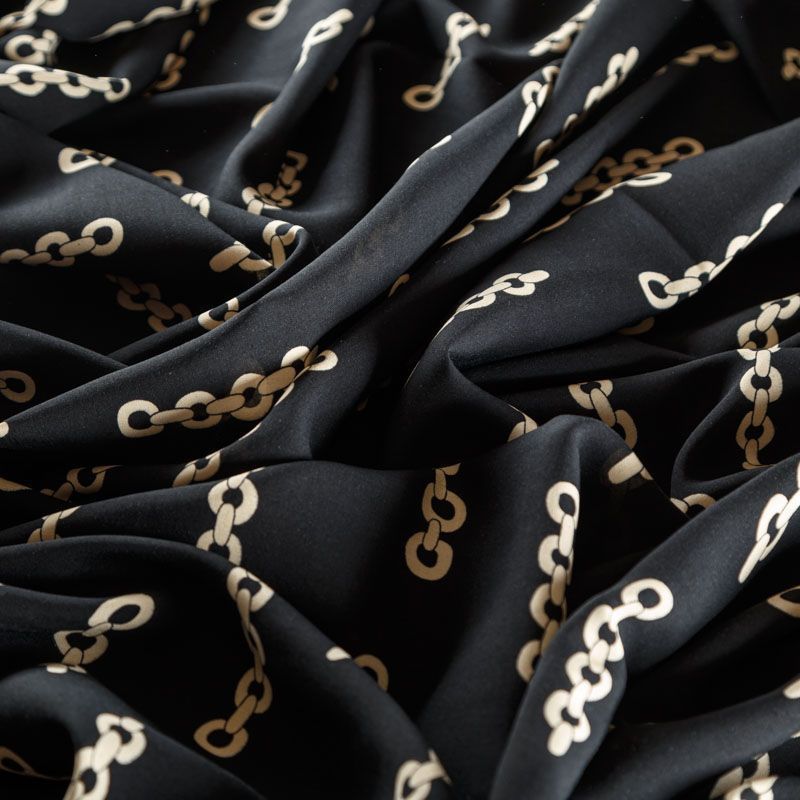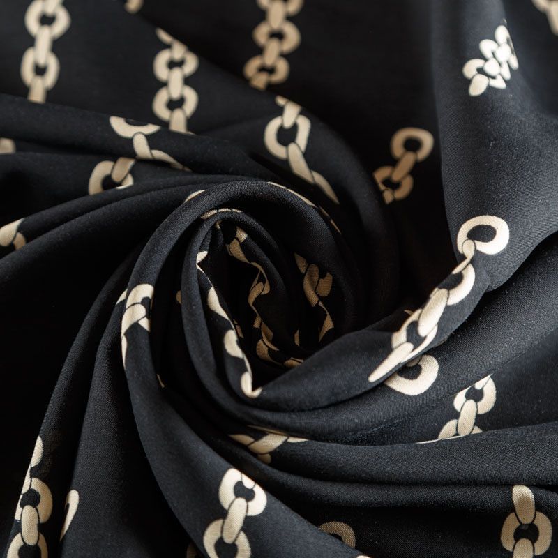 Плательно-блузочный штапель со стилизованным принтом в бежевом оттенке на черном фоне. Материал мягкий, тонкий, нежный, пластичный, приятный на ощупь, хорошо драпируется, практичный. Подойдет для пошива платья сарафана, топа, блузки, рубашки, юбки, летних брюк, комбинезона, а также домашней одежды.
