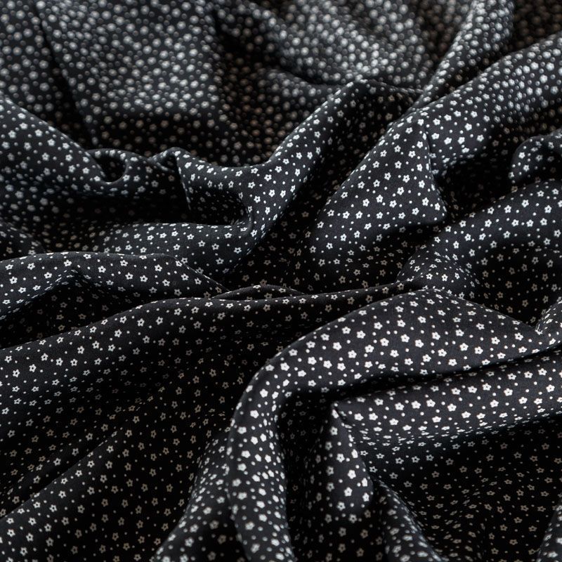 Плательно-блузочный штапель с мелким цветочным принтом на черном фоне. Материал мягкий, тонкий, нежный, пластичный, приятный на ощупь, хорошо драпируется, практичный. Подойдет для пошива платья сарафана, топа, блузки, рубашки, юбки, летних брюк, комбинезона, а также домашней одежды.