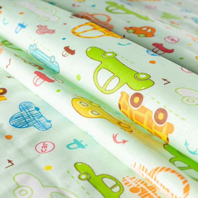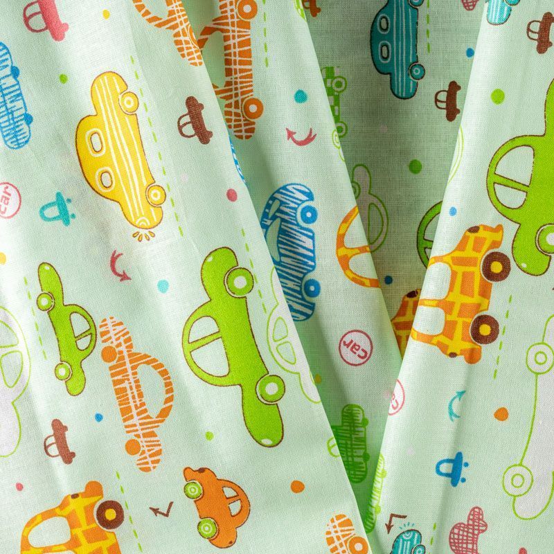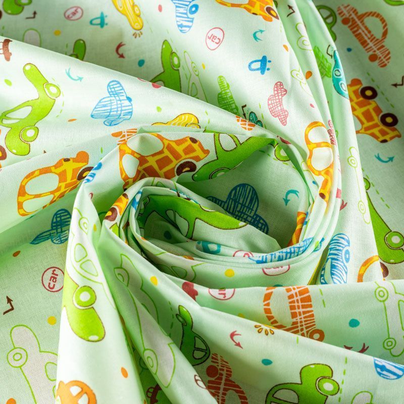 Ткань полотняного переплетения, тонкая, легкая и мягкая. Не вызывает аллергии, дышит и хорошо впитывает влагу. Милый принт в виде игрушечных машинок на светло-зеленом фоне прекрасно подойдет для пошива детской одежды, нательного белья, халатов и пижам.