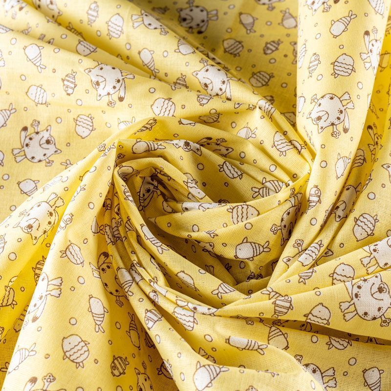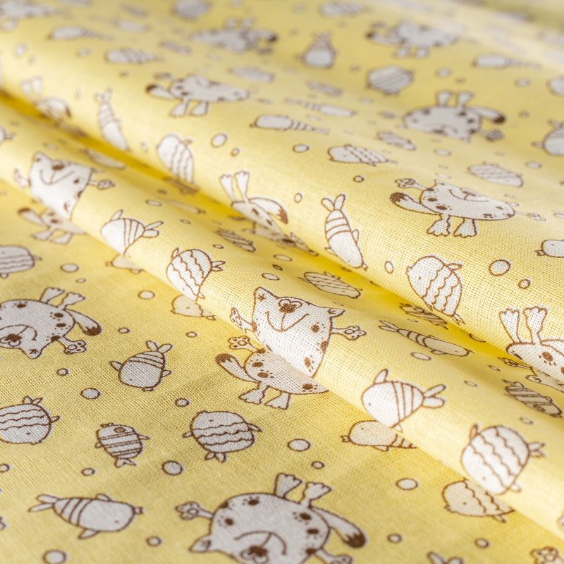 Ткань полотняного переплетения, тонкая, легкая и мягкая. Не вызывает аллергии, дышит и хорошо впитывает влагу. Милый детский принт в виде рисованных животных на светло-желтом фоне прекрасно подойдет для пошива детской одежды, нательного белья, халатов и пижам.