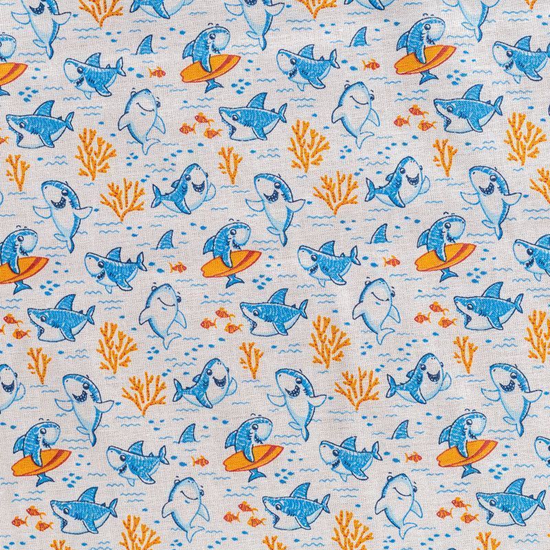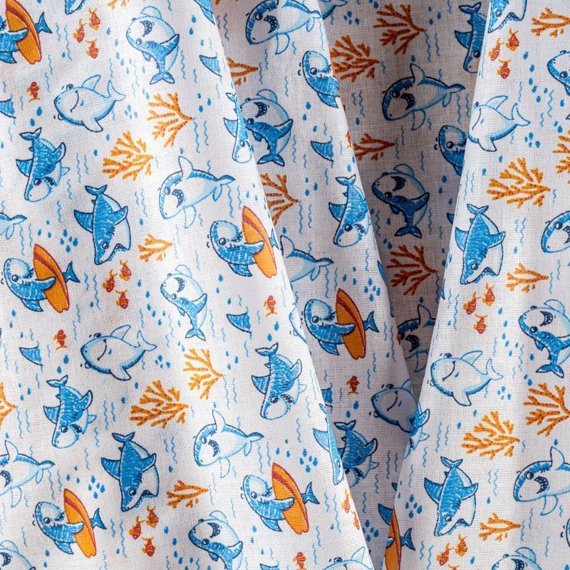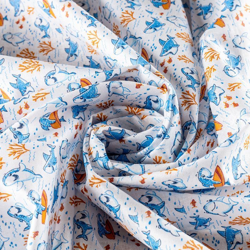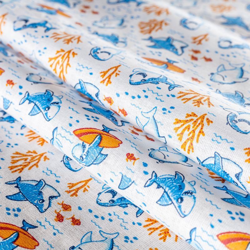 Ткань полотняного переплетения, тонкая, легкая и мягкая. Не вызывает аллергии, дышит и хорошо впитывает влагу. Милый детский принт в виде морских обитателей на белом фоне прекрасно подойдет для пошива детской одежды, нательного белья, халатов и пижам.