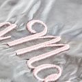 Вышивка на тафте Monnalisa высочайшего качества. Тафта жемчужно-серого оттенка тонкая, но плотная, отлично держит форму, драпируется красивыми жесткими складками и загибами. Фактура гладкая, с матовым блеском. Богатая объемная вышивка логотипа бренда выполнена шерстяной белой нитью идеально. Подойдет как для самостоятельного изделия: юбка, ярусное платье, плащ, парка, так и для декорирования любых изделий: вставка в рукав, оборка, кокетка и т.д.